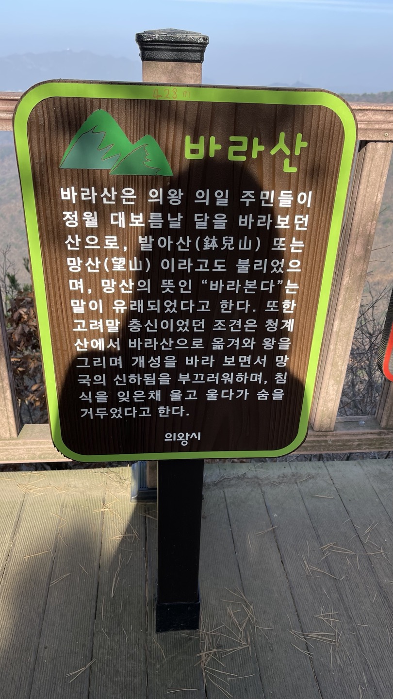 '바라산'은 경기도 의왕시 학의동과 용인시 고기동에 걸쳐있는 높이 427.5m의 산입니다.