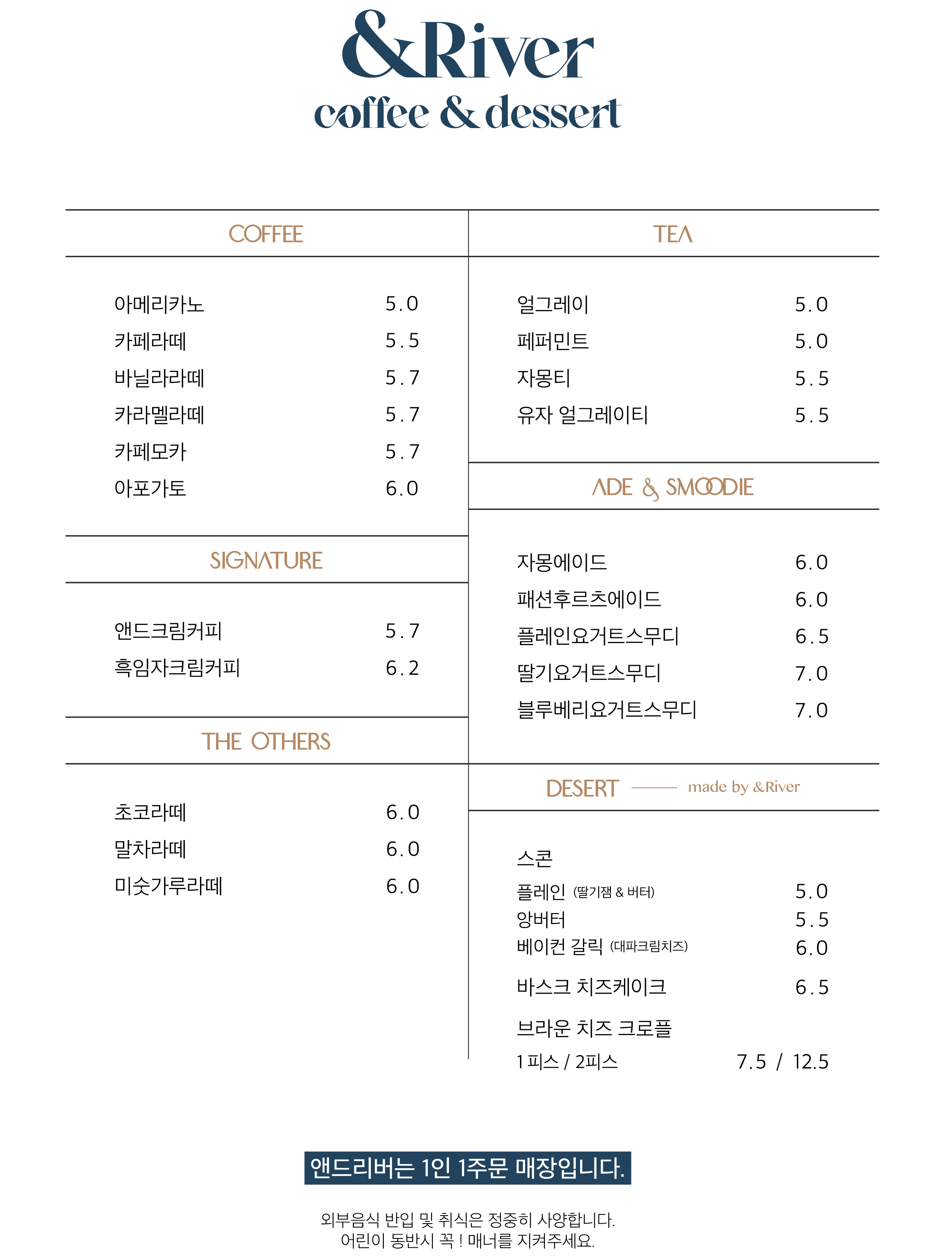 앤드리버(&River) 메뉴판이에요.