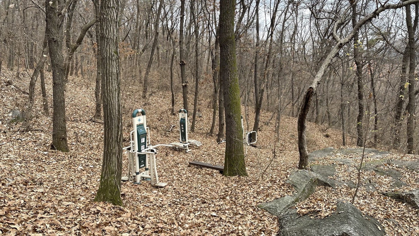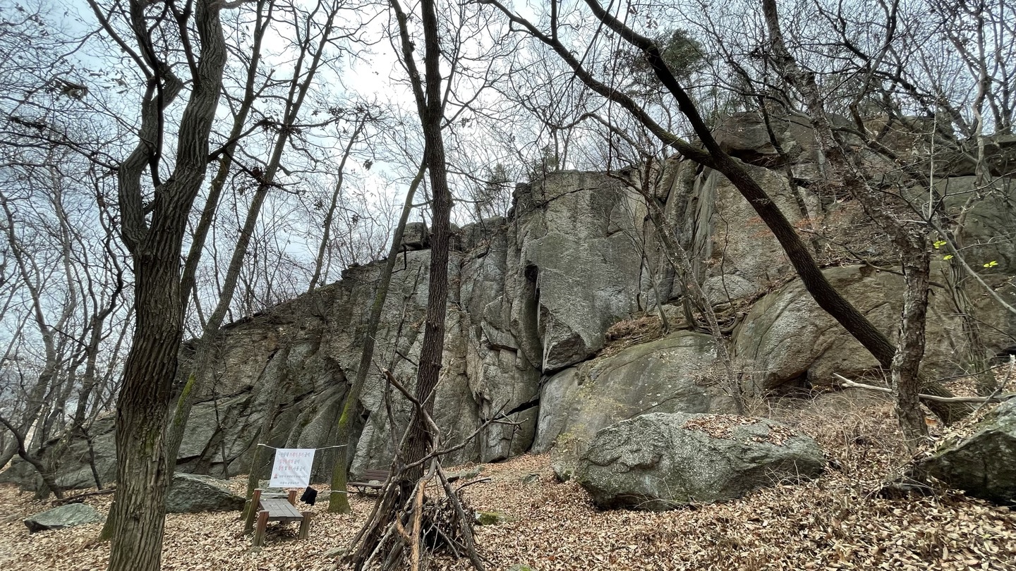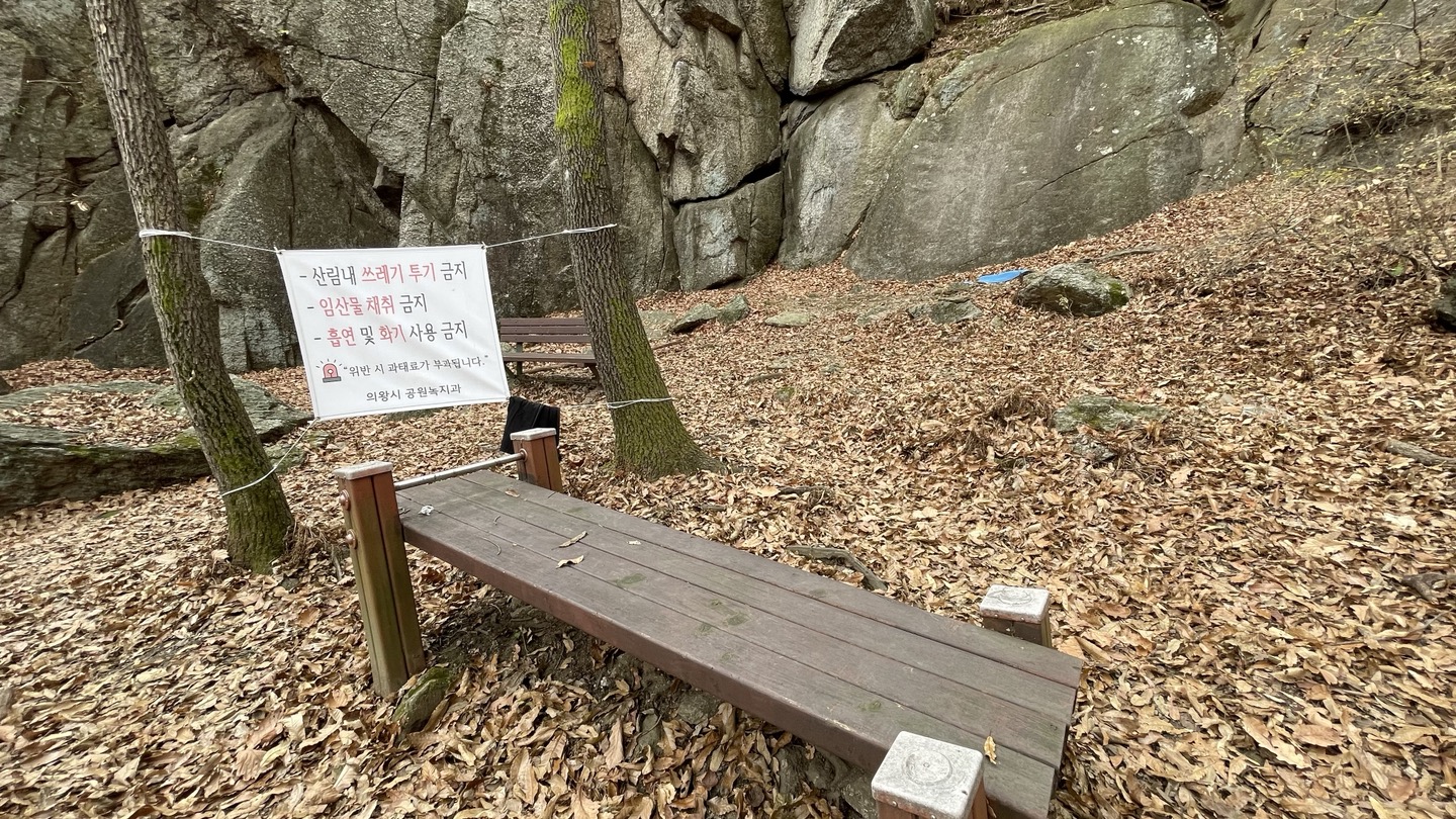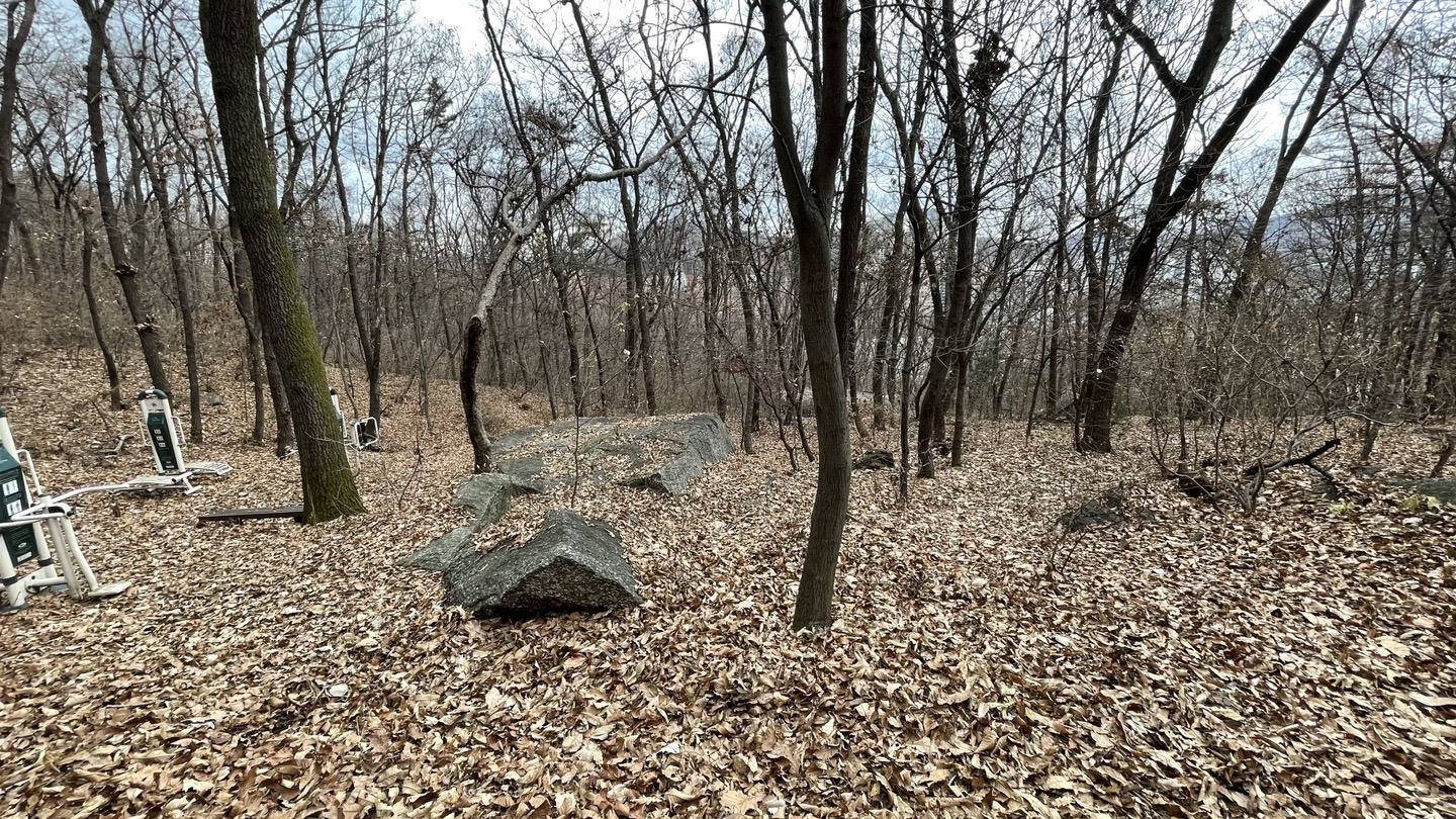 병풍바위 주변으로 운동기구와 벤치가 놓여 있어요. 병풍바위 주변으로 큰 바위들도 많이 흩어져 있습니다.