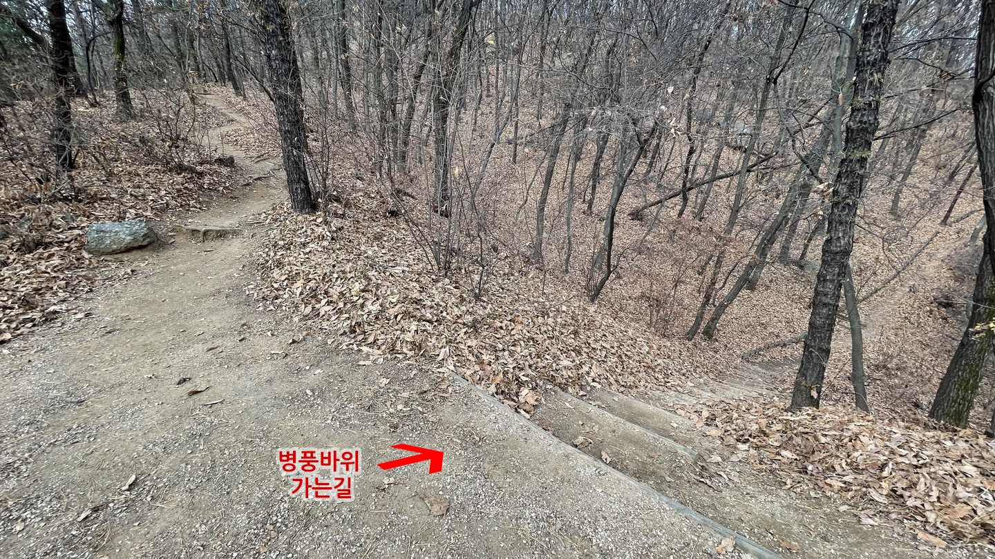 아래 이정표에서 오른쪽 옆쪽으로 난 내리막길로 가면 '병풍바위'로 바로 갈 수 있습니다. 병풍바위까지 0.19km