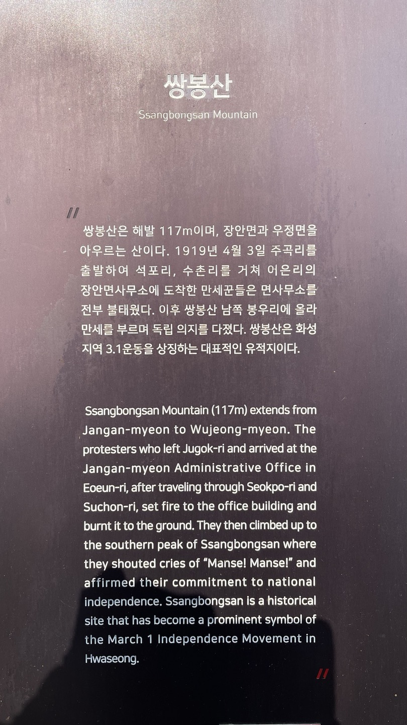 쌍봉산은 해발 117m로 장안면과 우정면을 아우르는 산입니다. 쌍봉산은 이 지역 주민들이 만세를 부르며 독립 의지를 다졌던 곳으로 화성지역 3.1운동을 상징하는 대표적인 유적지입니다.