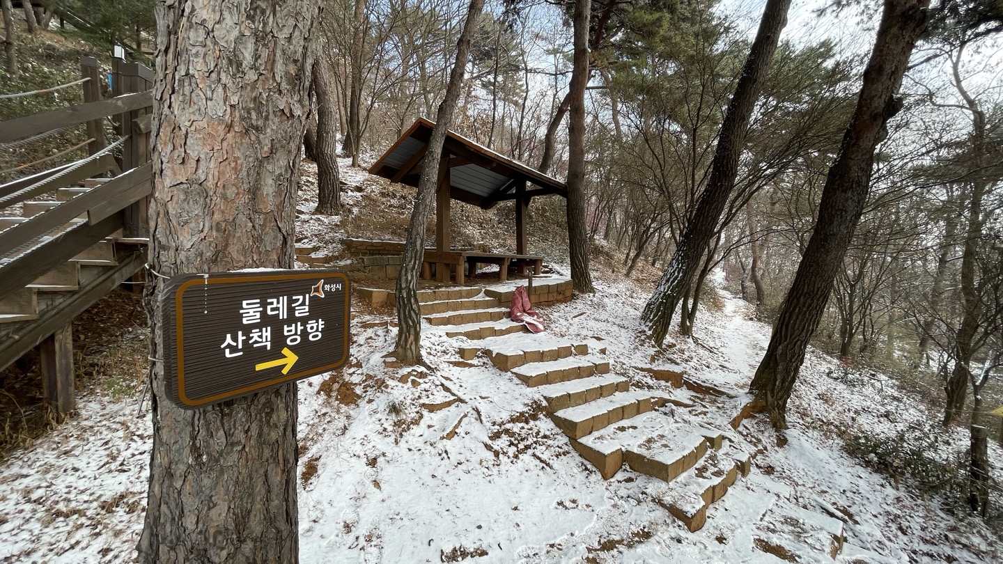 계단을 올라오다 보면 둘레길 산책길로 빠지는 길이 나옵니다. 둘레길 산책로의 총 길이는 1.2km정도 됩니다.