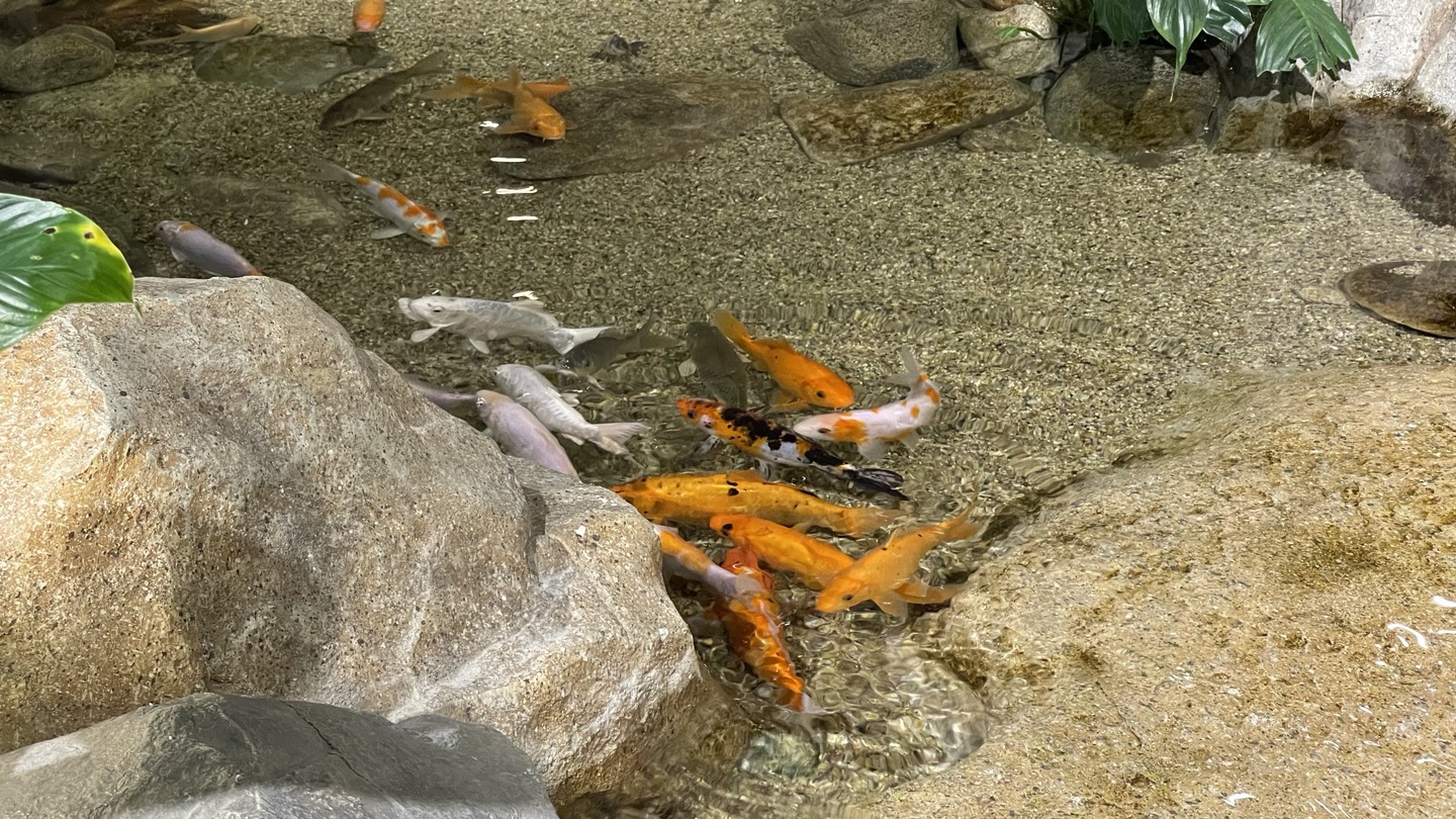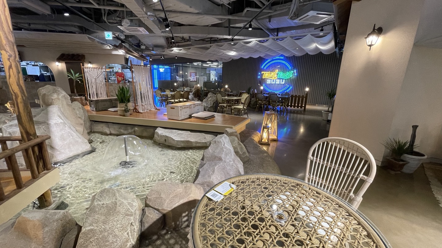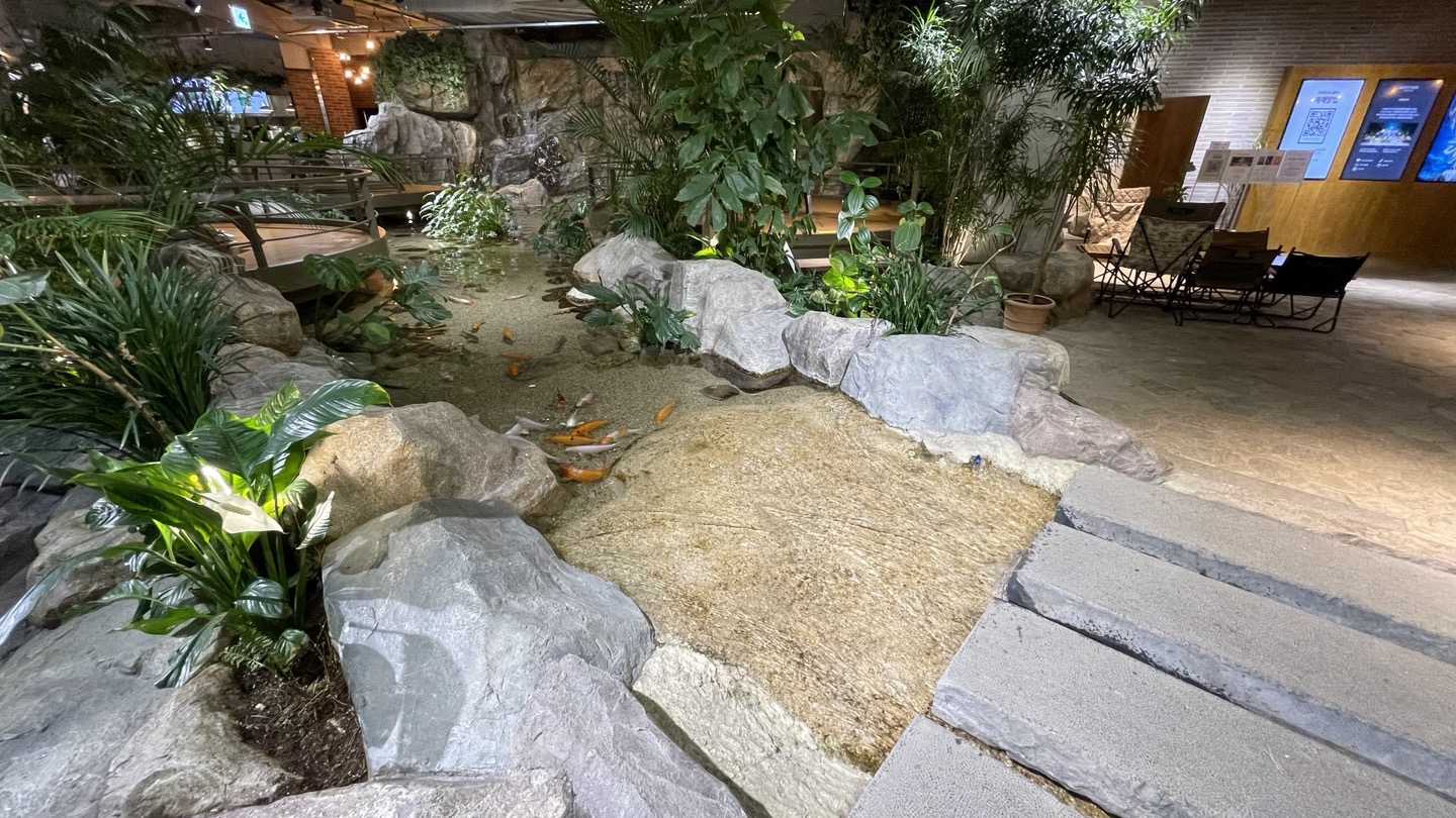여기는 벽면에 폭포가 있고 좌석들 옆으로는 연못이 조성되어 있어요. 계곡에서 물고기 노니는거 구경하는 기분이었어요. 물이 아주 깨끗하게 관리되고 있어서 더 좋더라고요.