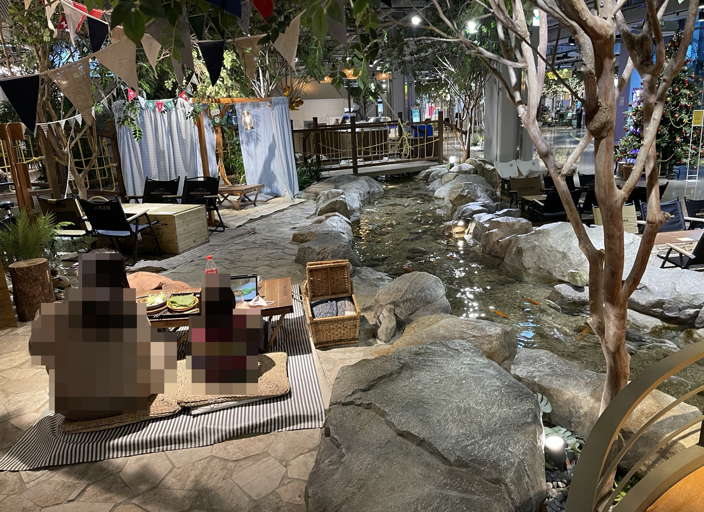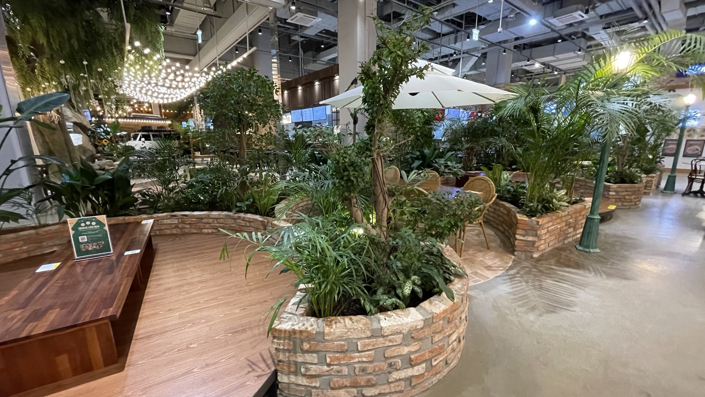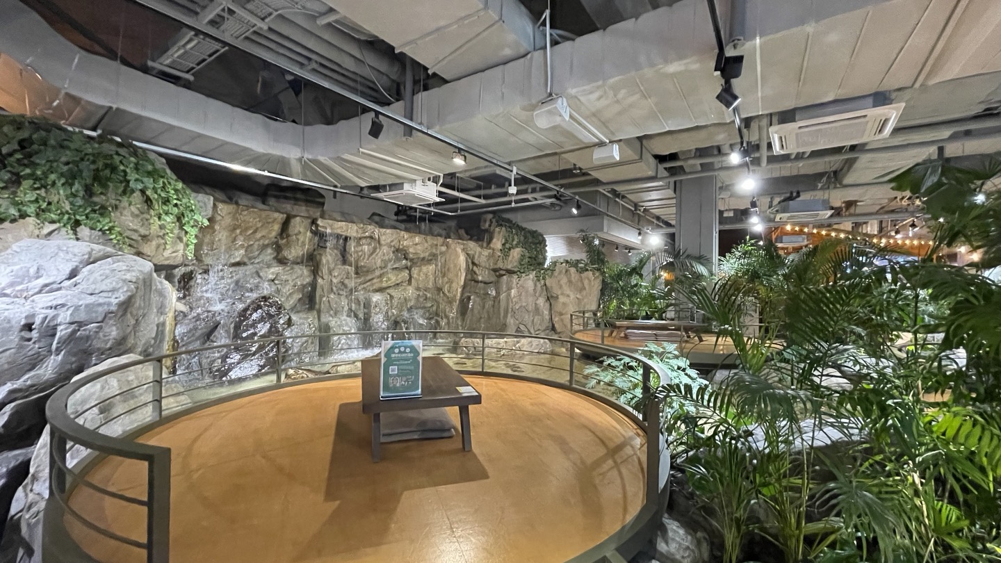 여기는 벽면에 폭포가 있고 좌석들 옆으로는 연못이 조성되어 있어요. 계곡에서 물고기 노니는거 구경하는 기분이었어요. 물이 아주 깨끗하게 관리되고 있어서 더 좋더라고요.