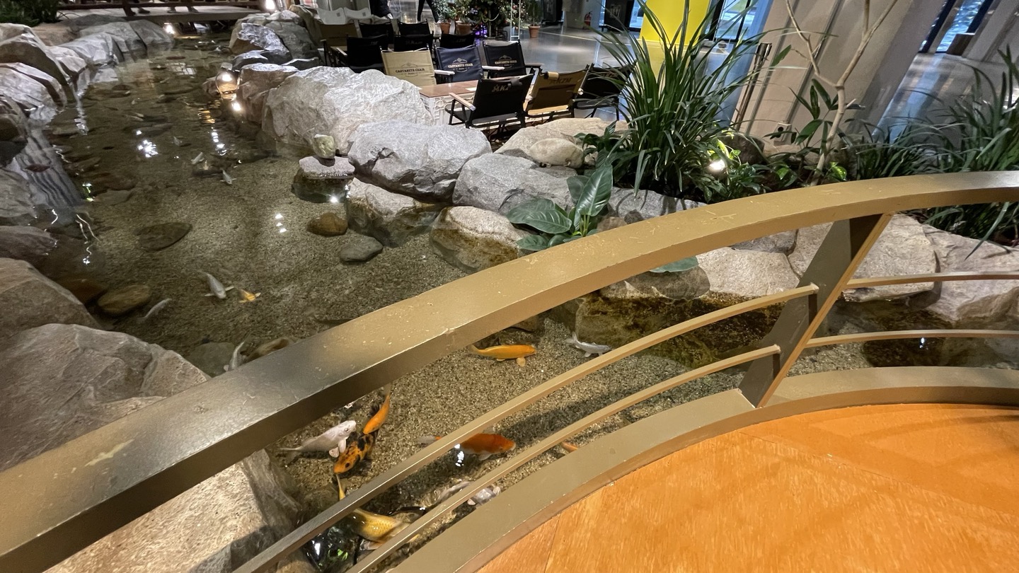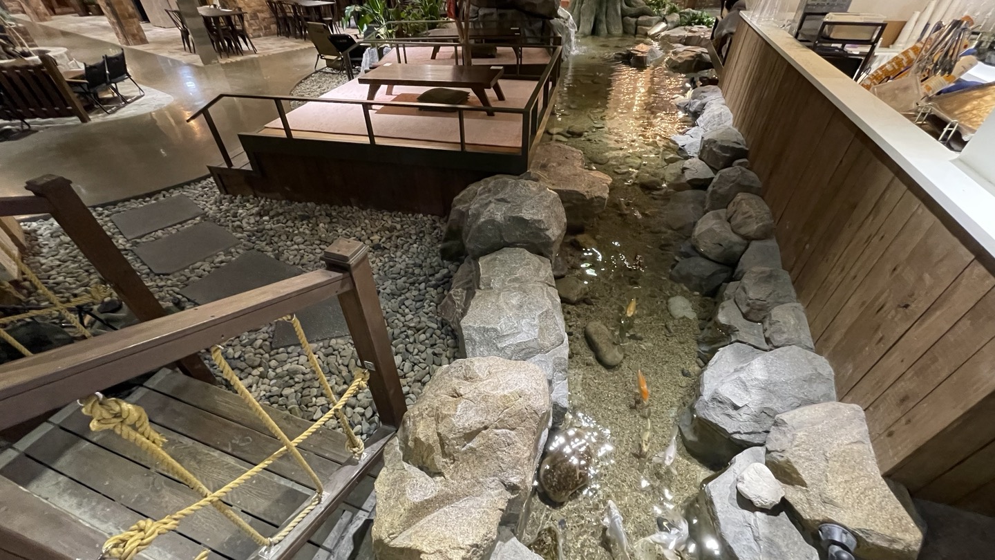 여기는 벽면에 폭포가 있고 좌석들 옆으로는 연못이 조성되어 있어요. 계곡에서 물고기 노니는거 구경하는 기분이었어요. 물이 아주 깨끗하게 관리되고 있어서 더 좋더라고요.