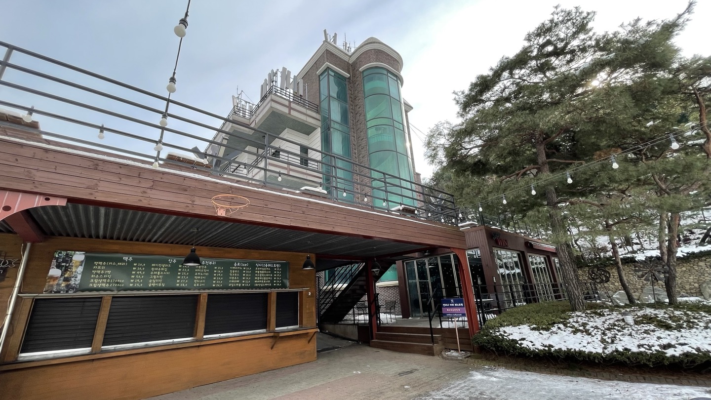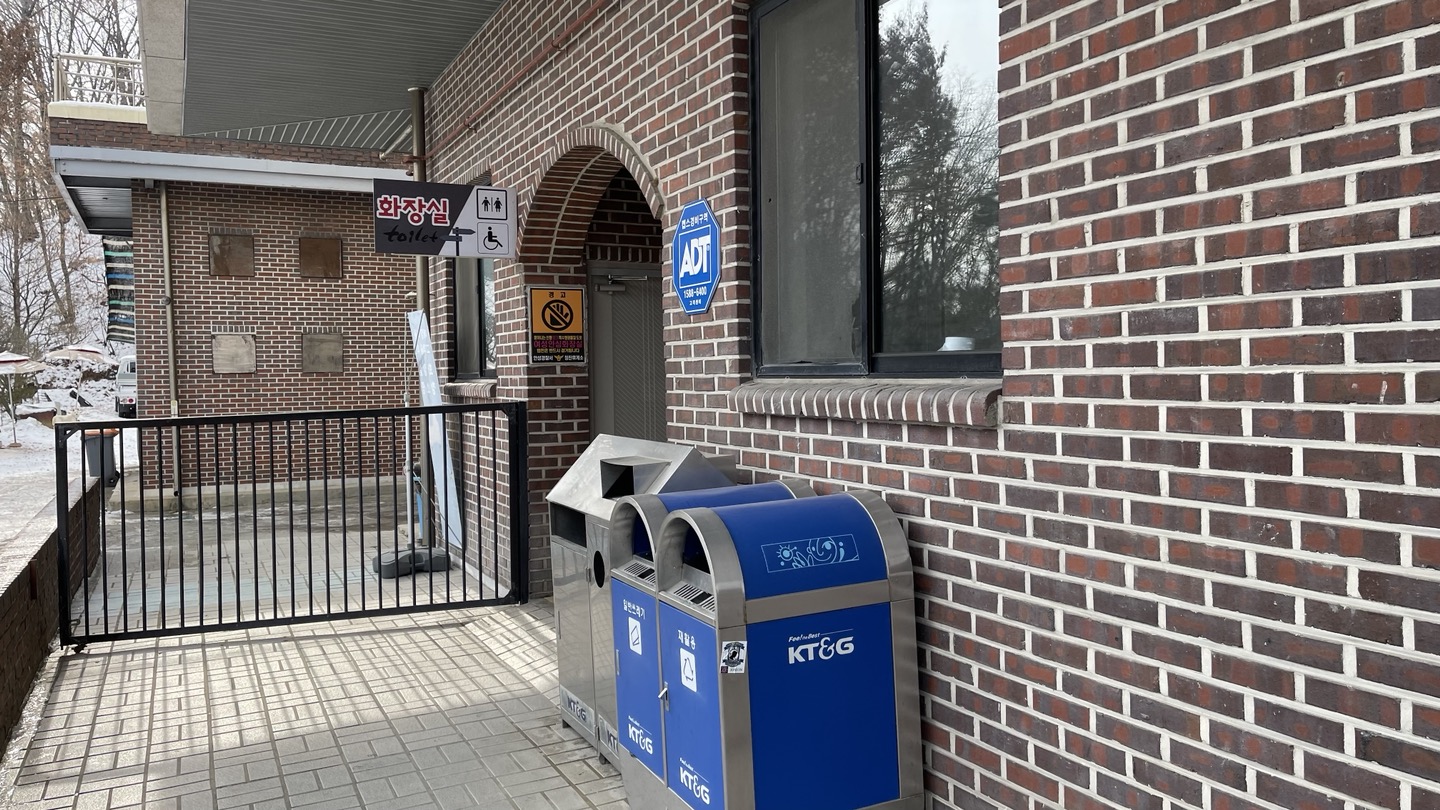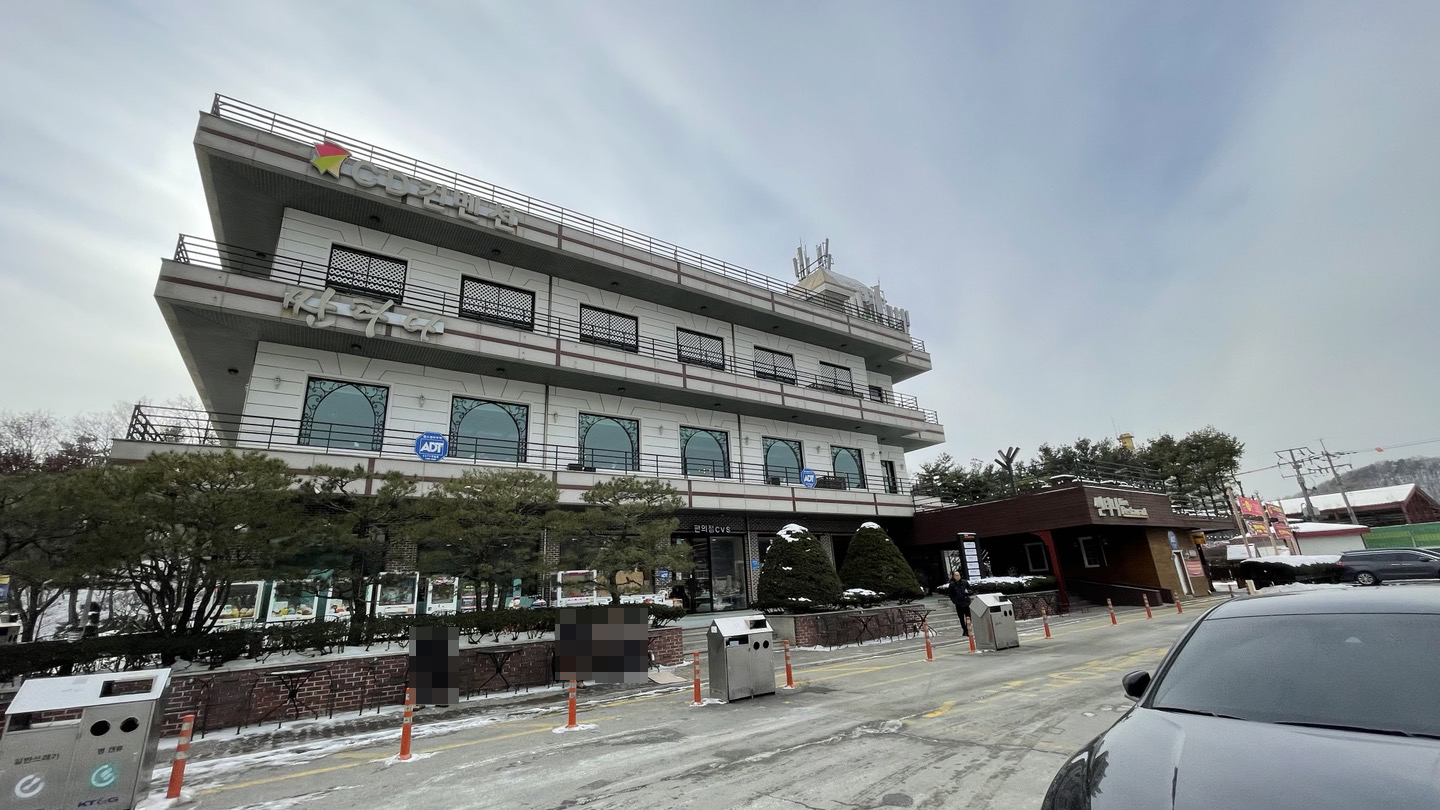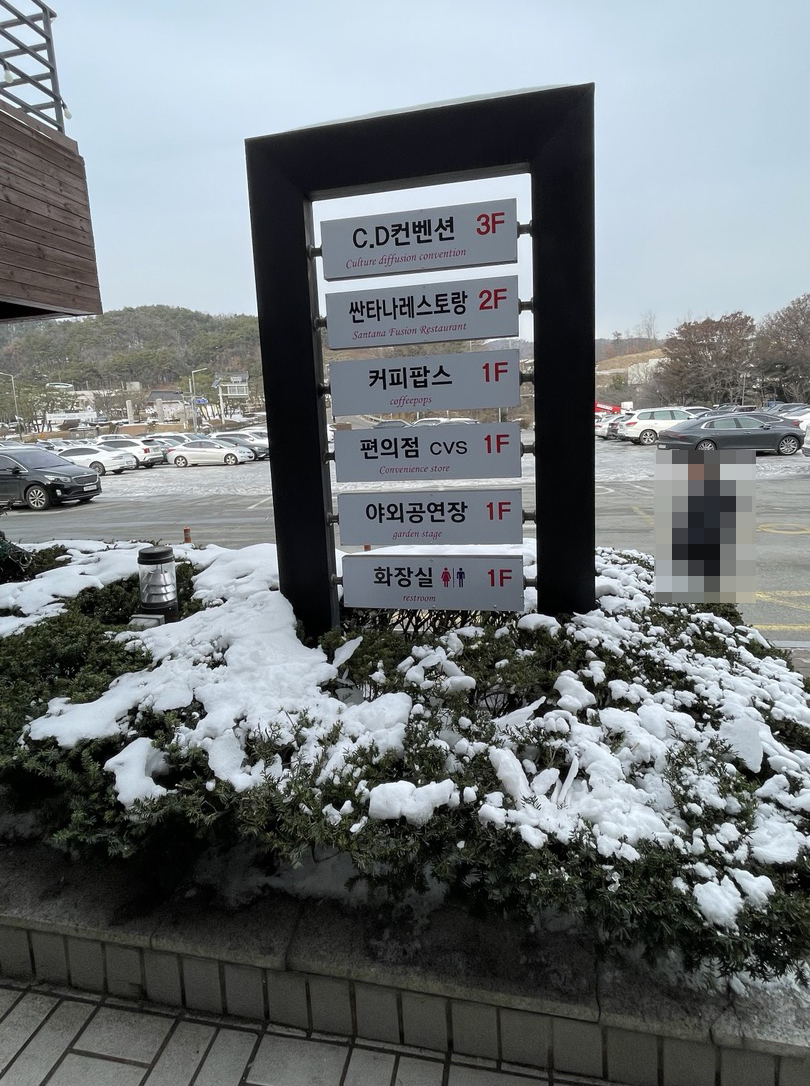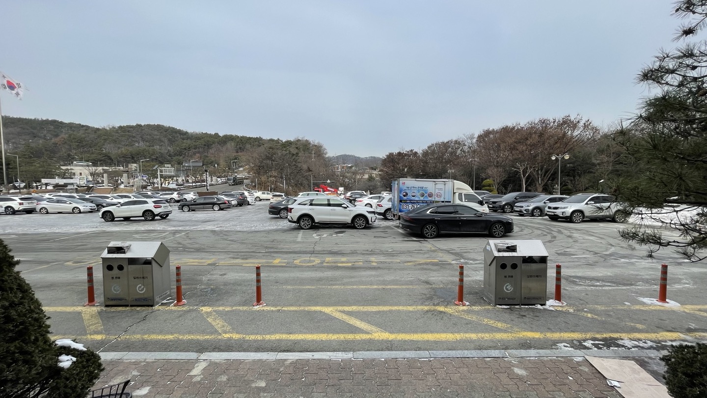 휴게소 앞에 있는 주차장입니다. 주차장 크기가 꽤 큰데요, 평일 오전임에도 불구하고 이미 많은 차들이 주차되어 있었습니다. 눈이 며칠째 많이 온 후라 주차장이 온통 빙판이었어요.