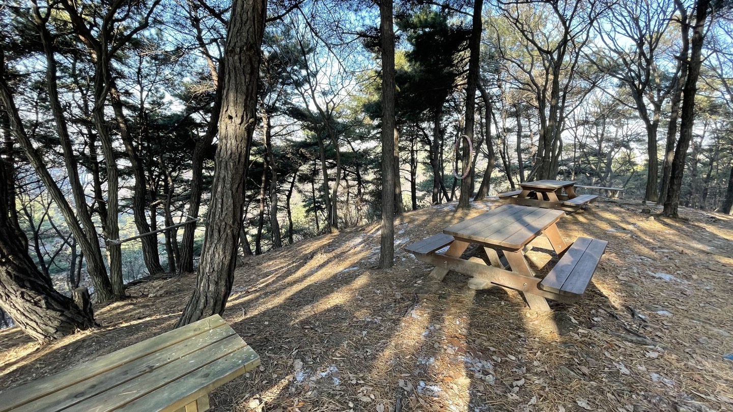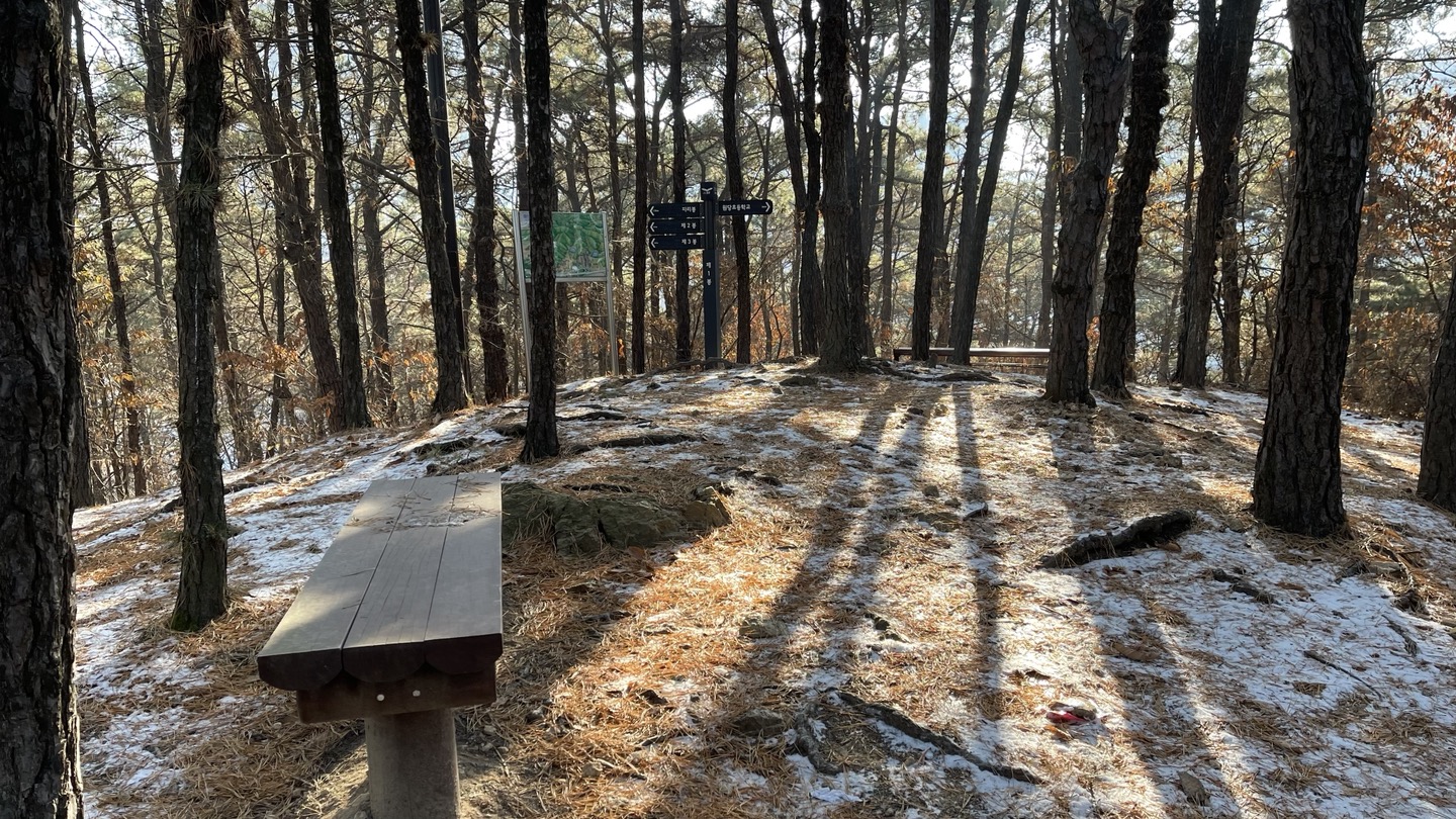 그런데... 의자와 운동기구 몇개가 전부네요;; 다른 산들의 정상처럼 주변이 확 틔이는 전망은 아닙니다.