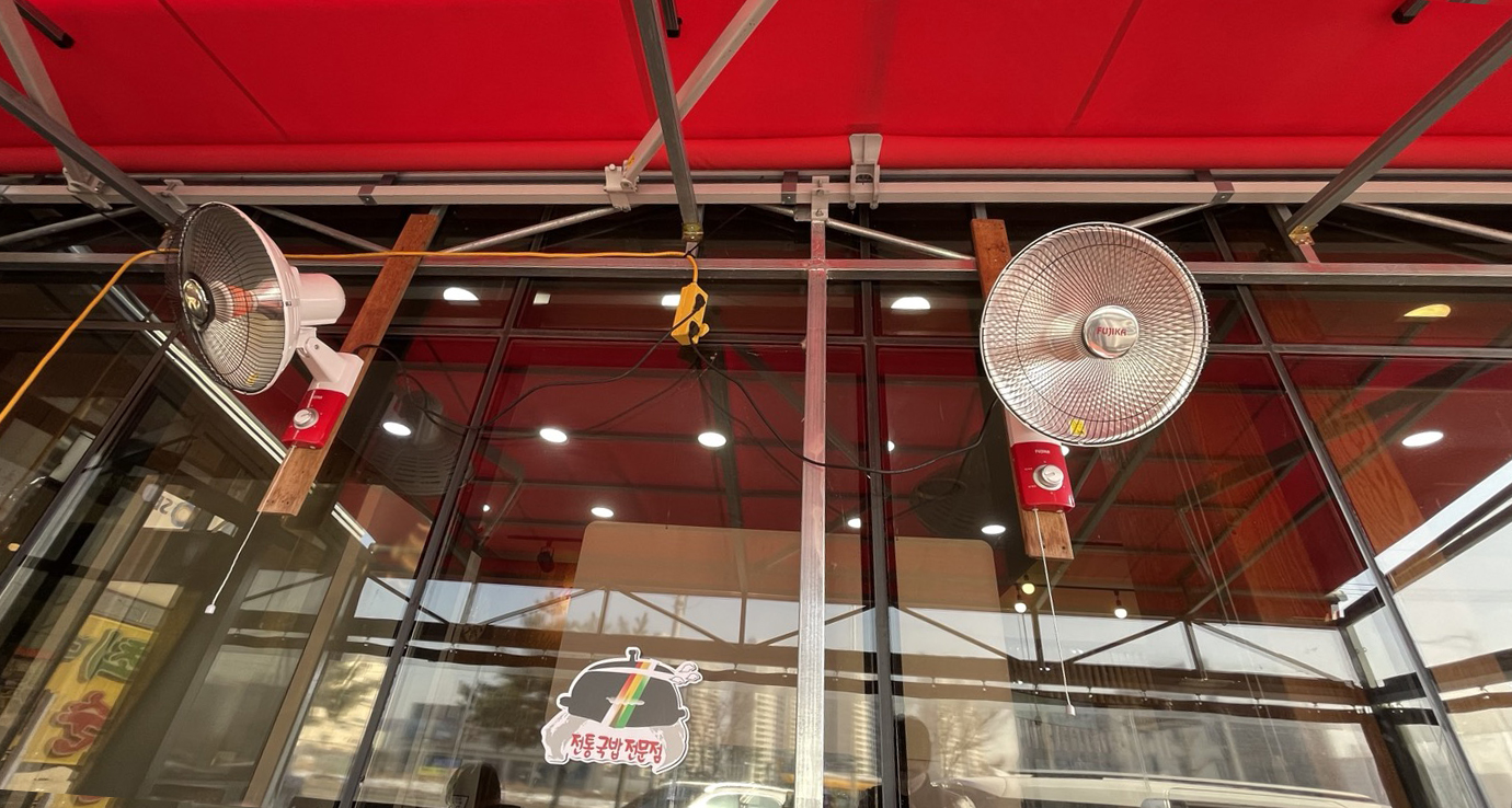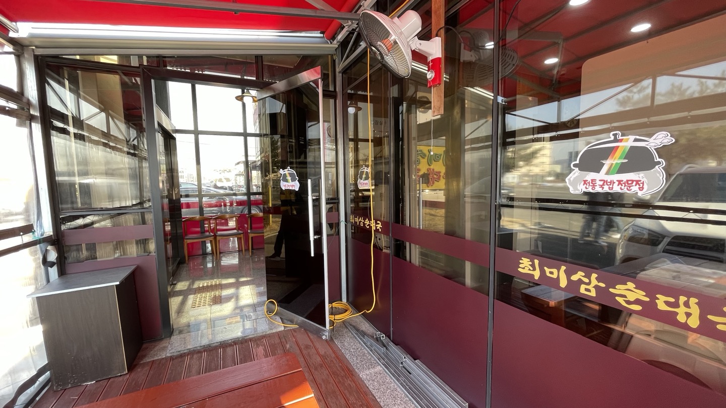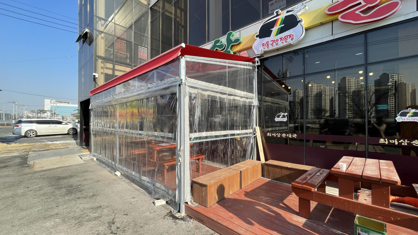 건물 입구 옆에 바람막이가 설치되어 있습니다. 대기표를 받고 기다리거나 식후 차 한잔 할 수 있는 공간입니다.