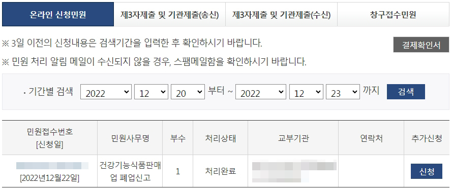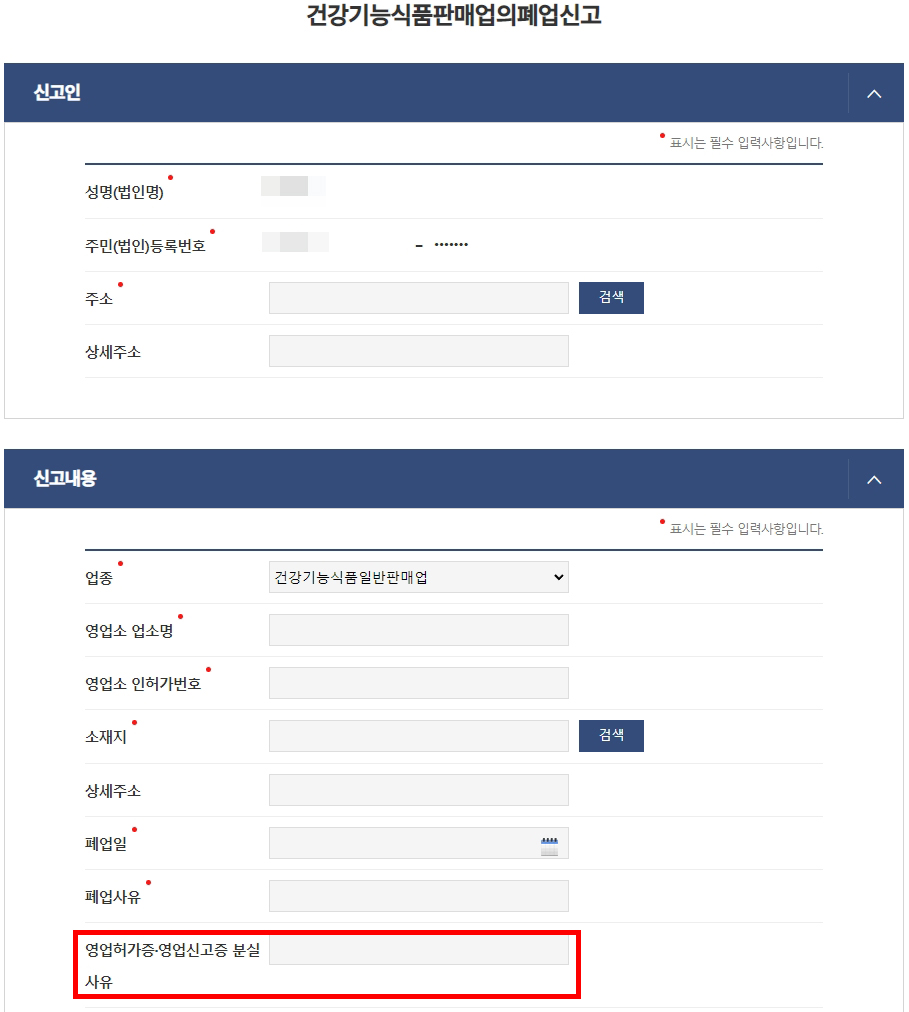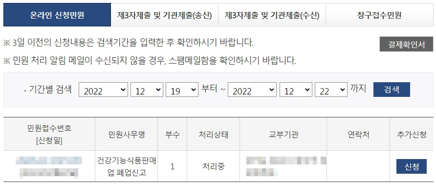 상품도 팔리지 않고 더 이상 판매할 의지도 없어서 담당 복지위생과 주무관에게 문의를 했는데요. 해당 상품을 더 이상 판매하지 않는다면, 별도로 '건강식품 폐업신고'를 진행해야 과태료가 부과되지 않는다는 안내를 받았습니다.