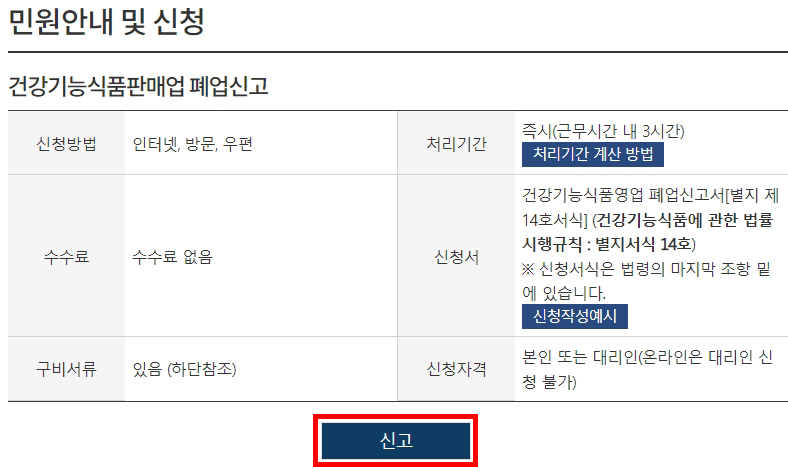 3. '건강기능식품판매업 폐업신고'를 클릭하면 아래와 같이 해당 민원에 대한 상세정보가 나옵니다. '신고'버튼을 눌러 신고 페이지로 이동합니다.