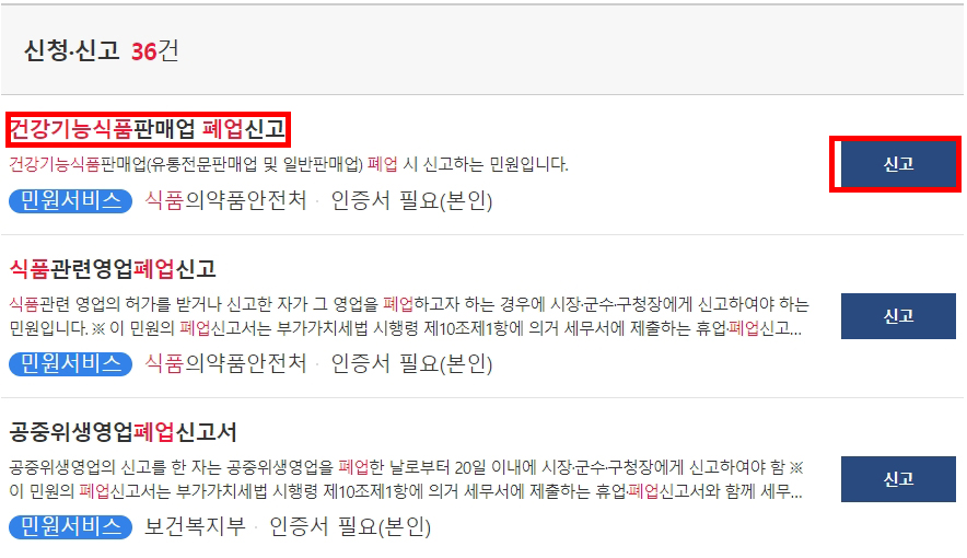 2. '건강식품폐업'을 클릭하면 아래와 같이 검색결과가 나옵니다. 그 중 '건강기능식품판매업 폐업신고'를 클릭합니다. (또는 '신고'버튼을 눌러 바로 신고 페이지로 갈 수도 있습니다.)