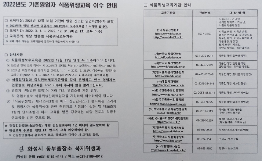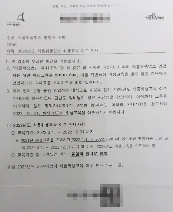 '식품위생교육' 이수 안내문과 '건강보조식품 법정교육'과 관련된 안내문이었습니다.