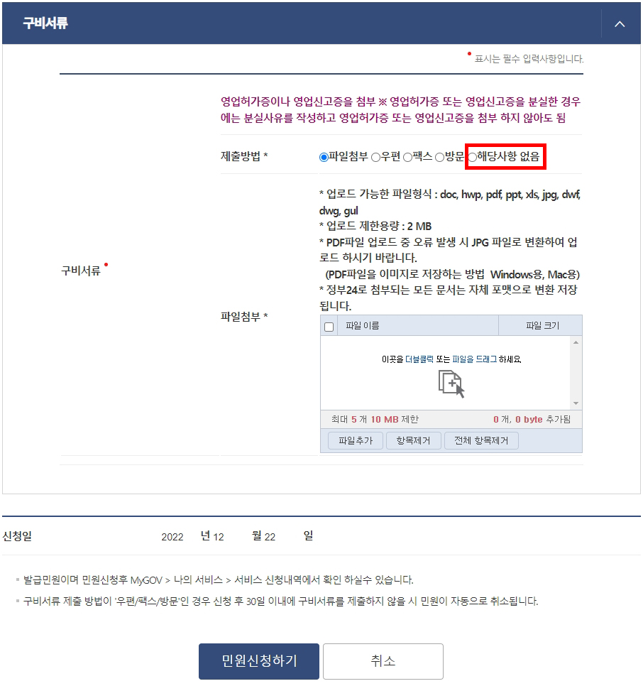 영업허가증이나 영업신고증을 분실했을 경우 '구비서류>제출방법>해당사항없음'을 선택하고 민원신청을 진행하면 됩니다.