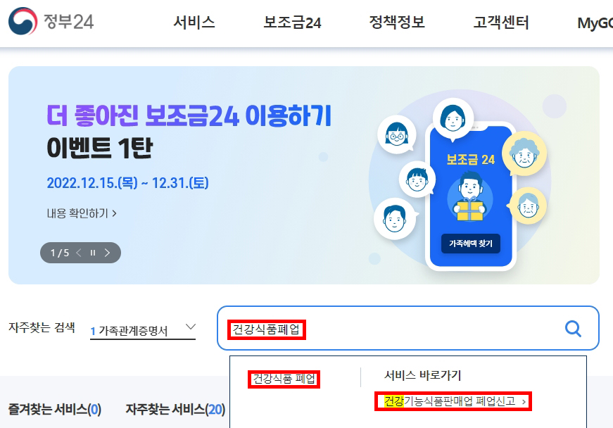 1. 정부24 홈페이지에 접속해서 검색란에 '건강식품폐업'을 검색한 후 '건강식품폐업'을 클릭합니다. (또는 '서비스 바로가기>건강기능식품판매업 폐업신고'를 눌러 바로 신고 페이지로 갈 수도 있습니다.)