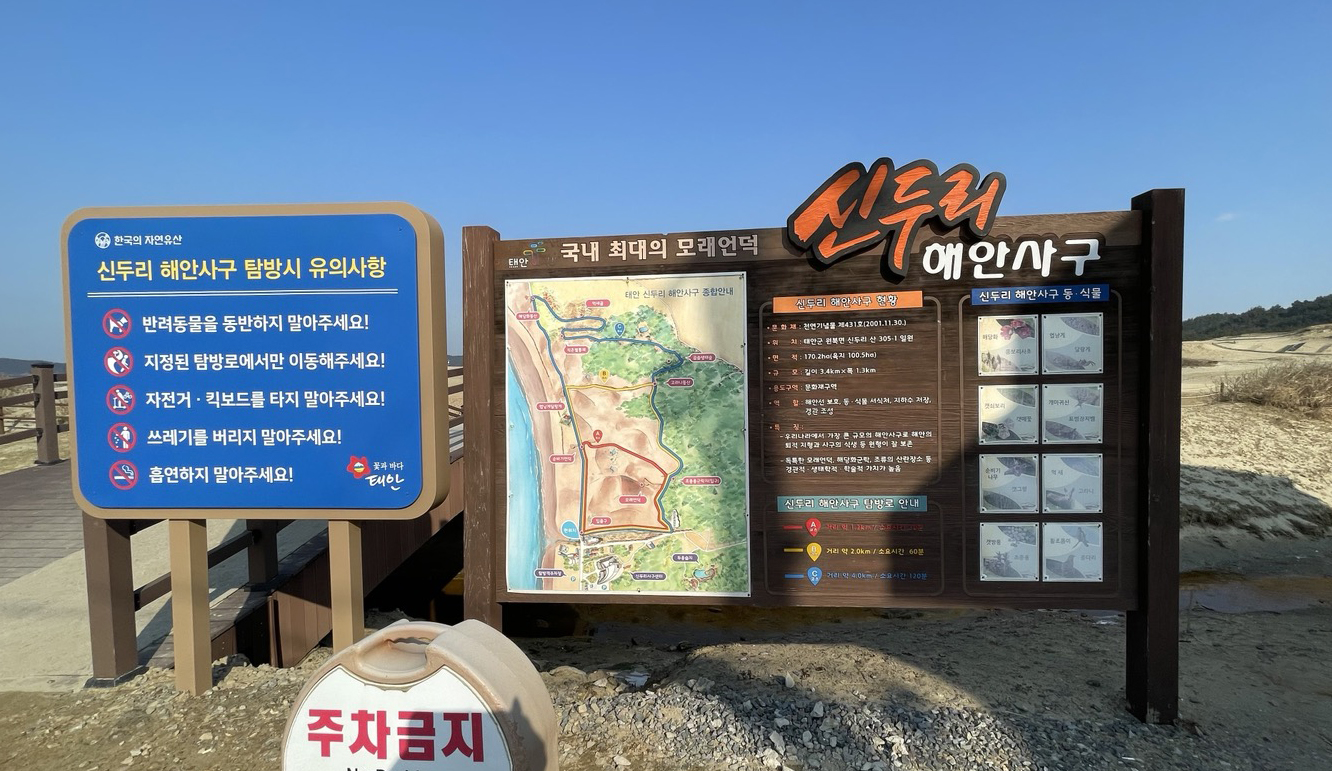 네비에 '신두리 해안사구'를 검색하고 가다보면 넓은 주차장과 안내판이 보입니다.