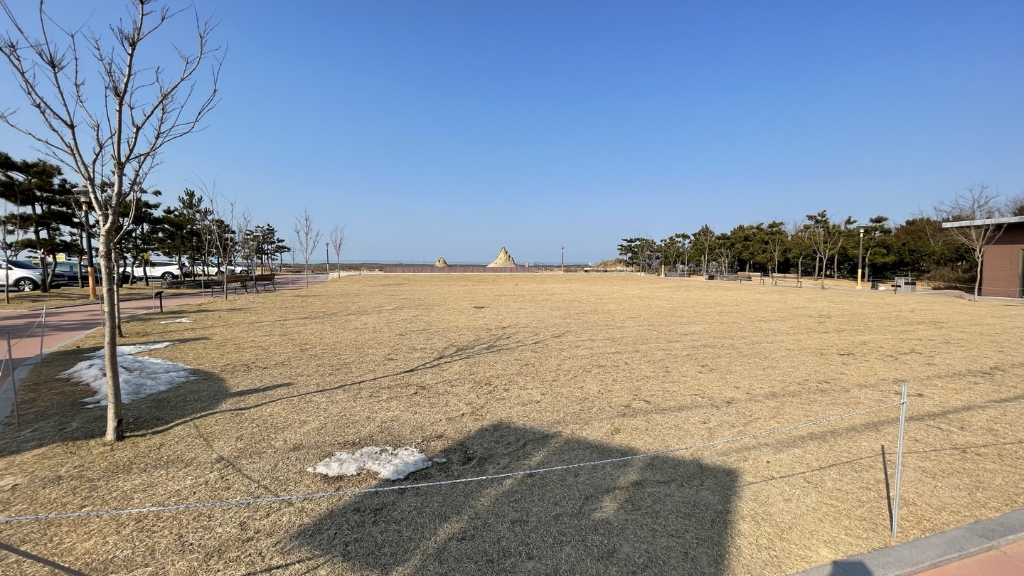 주차장 뒤로 작은 공원이 조성되어 있습니다. 멀리 모래조각 작품이 보이네요.