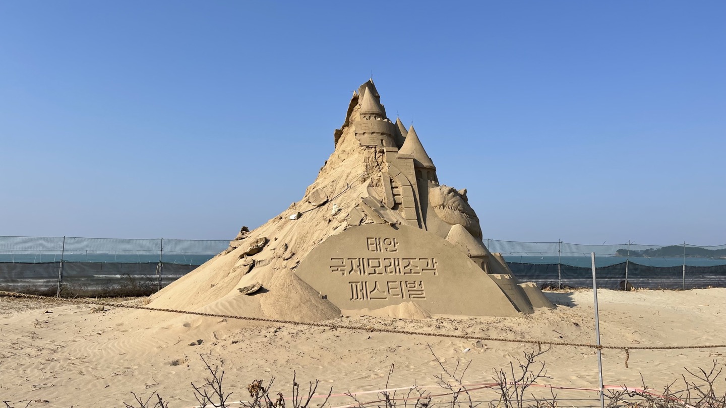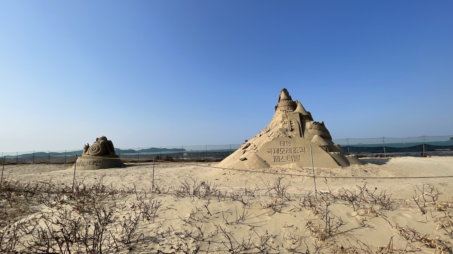 모래조각상 쪽으로 걸어가보니 '태안 국제모래조각 페스티발'이라고 쓰인 모래조각상 2점이 전시되어 있었습니다.