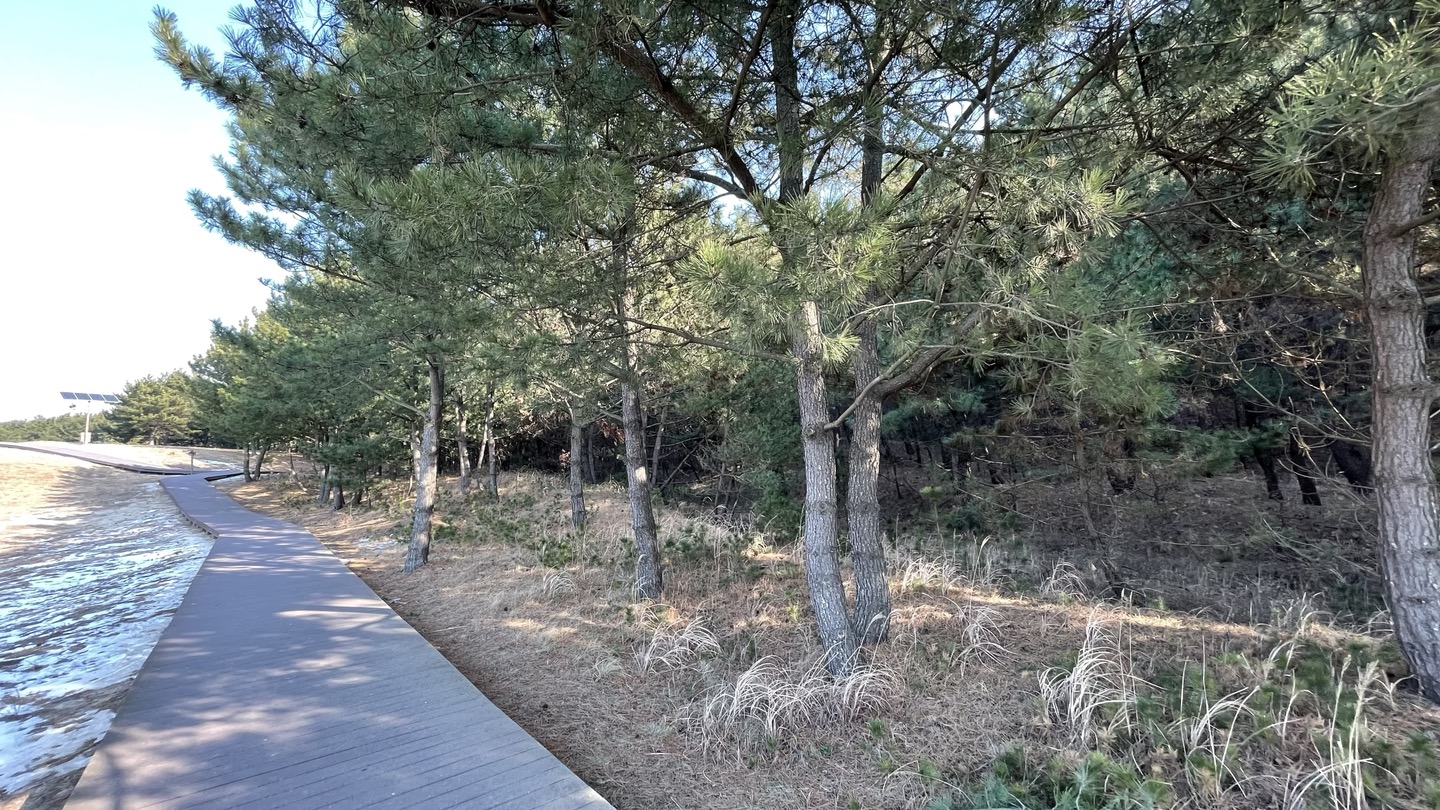 모래언덕 맞은편에는 소나무숲이 펼쳐져 있어 대조적인 풍경을 만듭니다.
