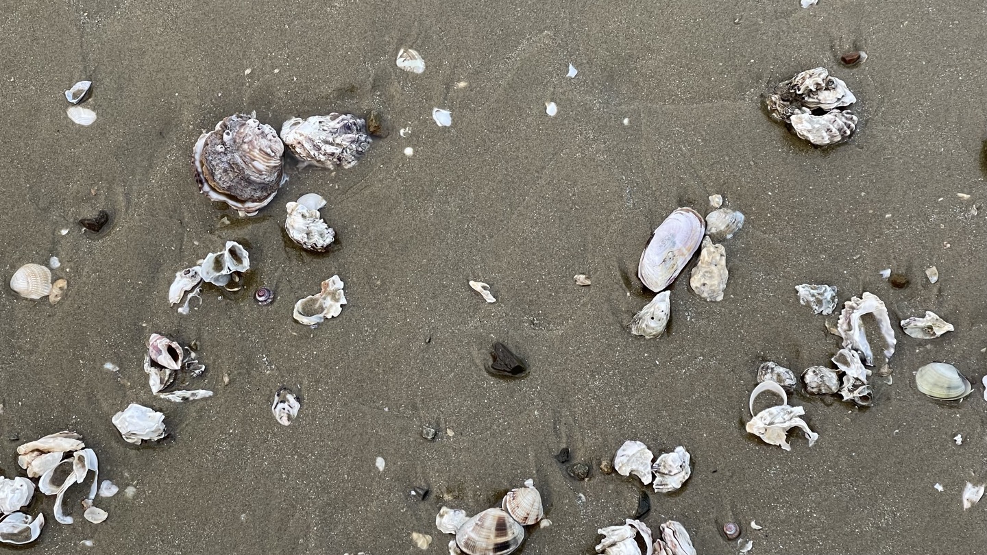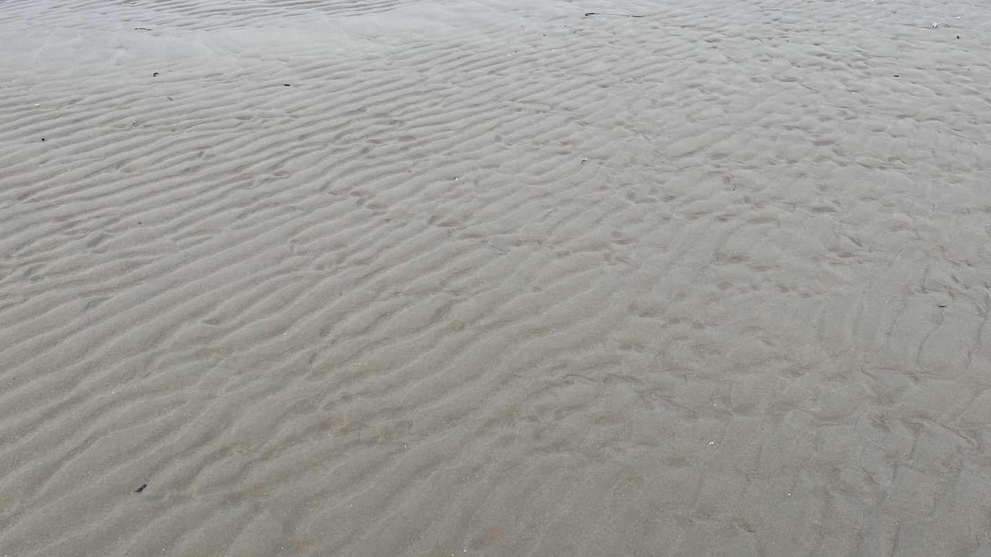 물결이 만들고 간, 그야말로 물결무늬가 뚜렷히 보입니다. 갯벌에 널려있는 조개, 굴 껍질들은 이 곳이 바다였다는 사실을 증명하고 있고요.^^