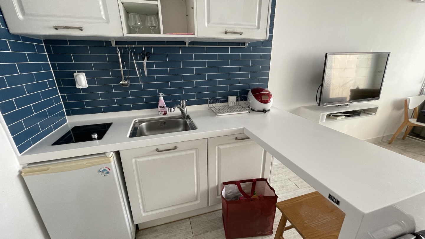 주방입니다. 하이라이트, 전기밥솥, 전자렌지, 냉장고, 그릇, 주방도구 등등...기본적인 주방용품 갖춰어져 있습니다.