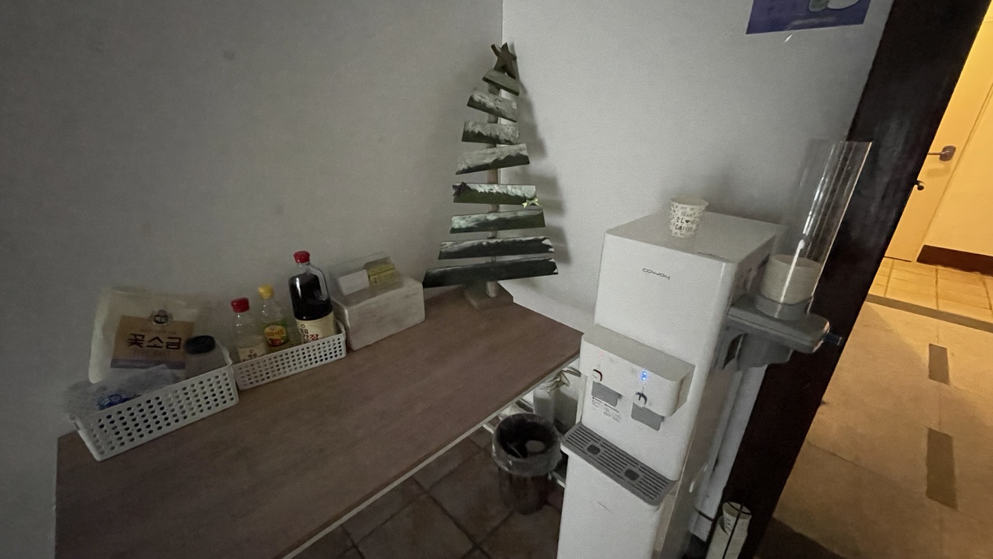 1층에 정수기와 양념들 준비되어 있는데.... 외부에 노출되어 있다보니 그닥 사용하고 싶지는 않아 보였습니다;