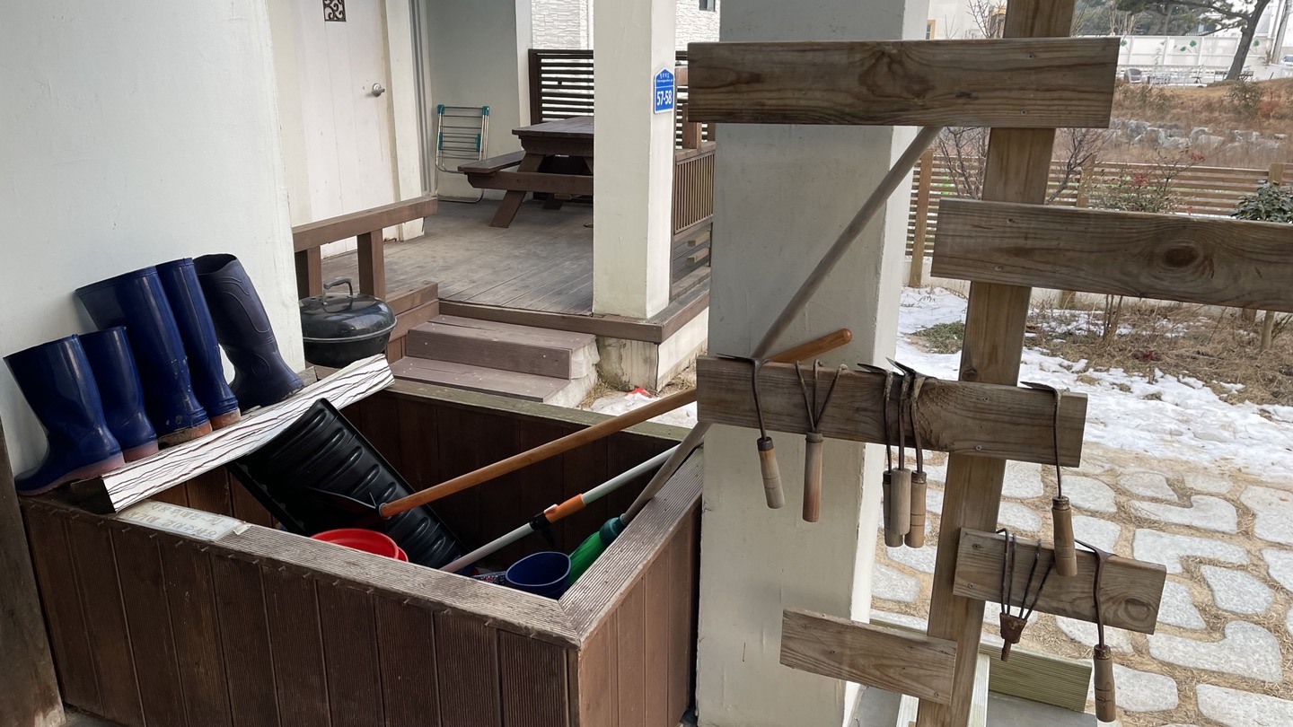 건물 입구 앞에 갯벌체험을 할 수 있는 도구들이 보이네요. 펜션측에서 무료로 대여하는 서비스입니다.