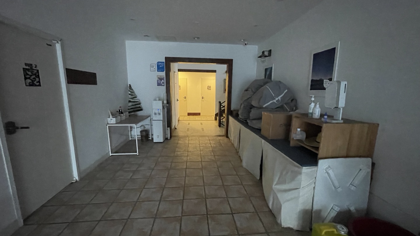 아리바다펜션 현관을 들어오면 1층 객실들이 보이고, 입구쪽에 물건들이 많이 쌓여 있습니다.
