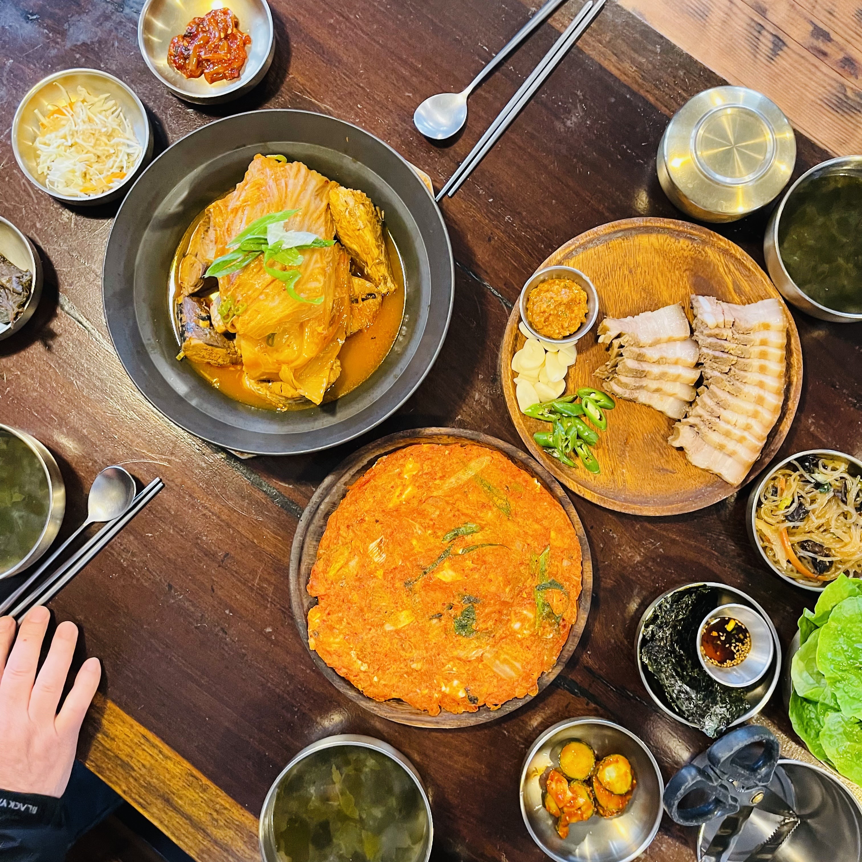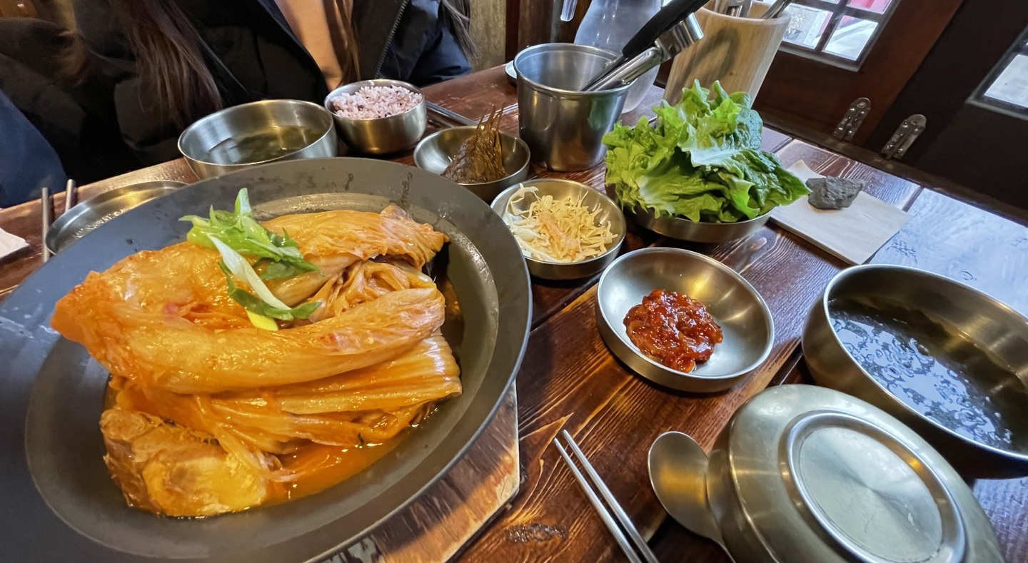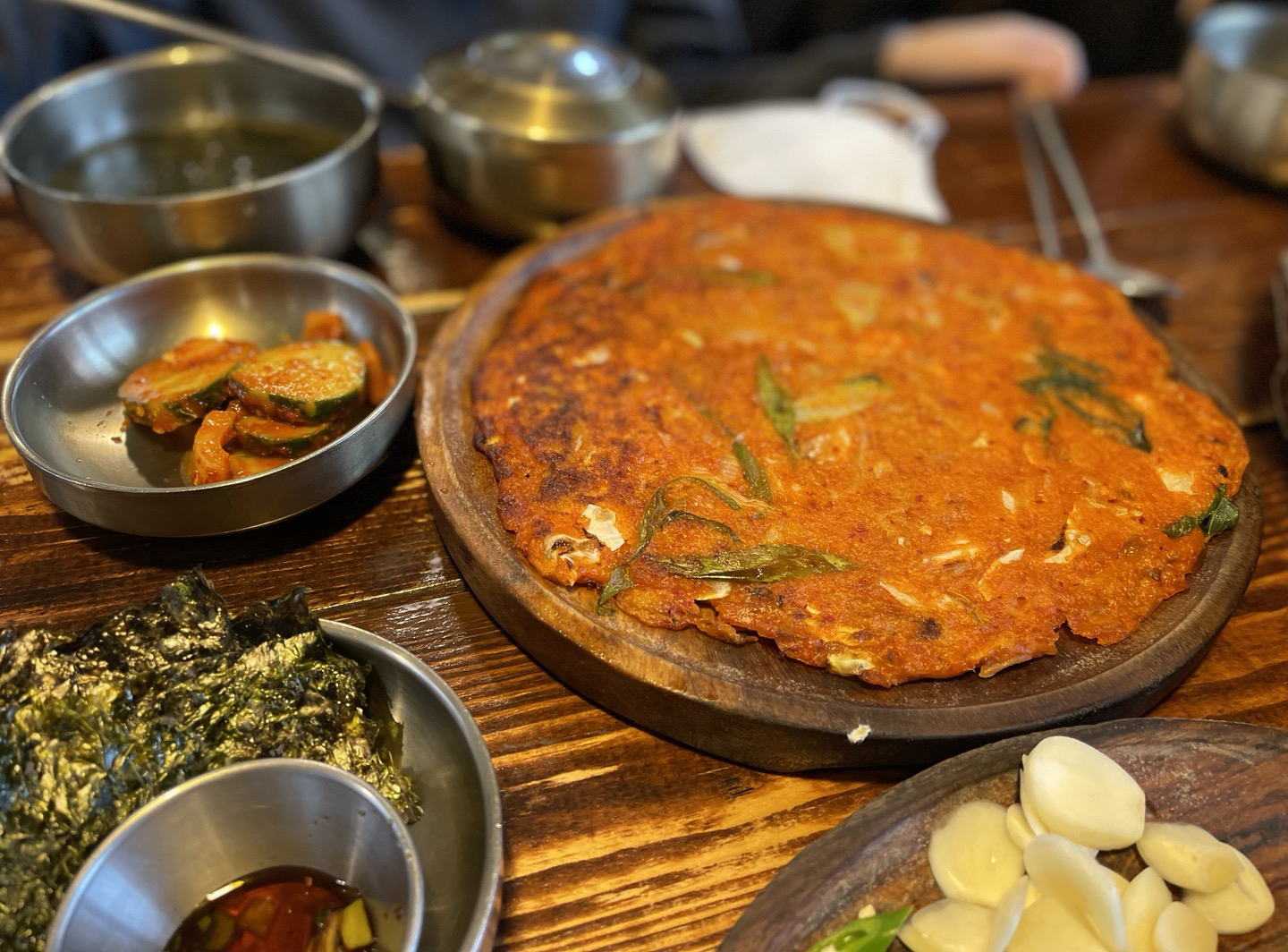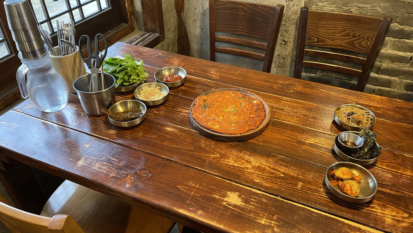 도착하기 전 '회춘정식'을 예약하고 왔는데요, 도착하니 기본 반찬과 커다란 김치전이 미리 세팅되어 있었습니다.