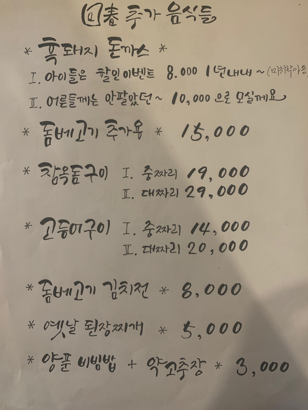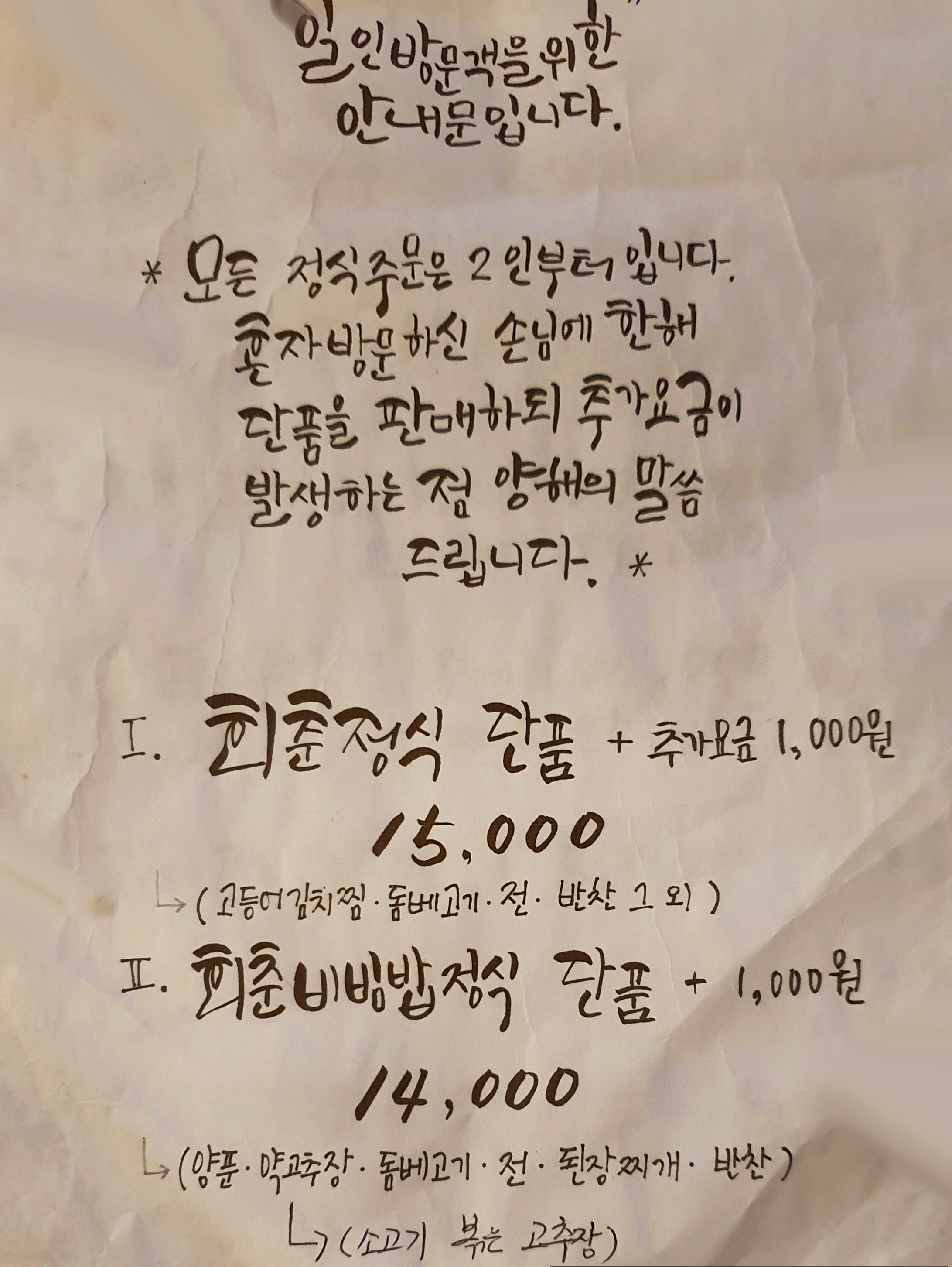 모든 정식 주문은 2인 이상부터가 원칙이지만 1인 방문객을 위해 추가요금을 받고 단품으로도 판매하고 있습니다.