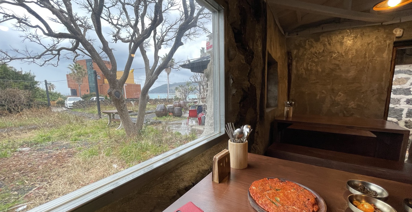 큰 창을 통해 멀리 바다가 보입니다. 뷰 맛집이네요.^^