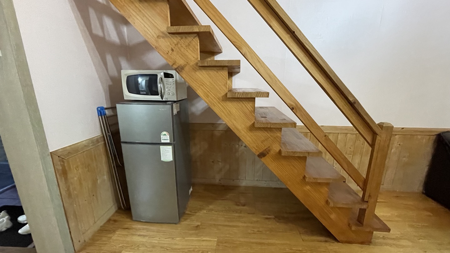 윗층으로 올라가는 계단 밑에 냉장고와 전자렌지, 빨래건조대가 있습니다.