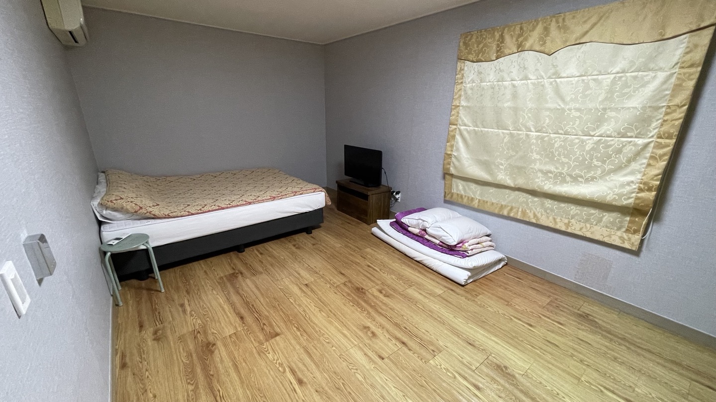 1층 방입니다. 침대, 옷걸이, 에어컨 등 있습니다. 인원수에 맞게 여분의 이불이 제공됩니다.