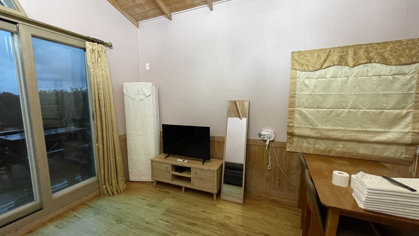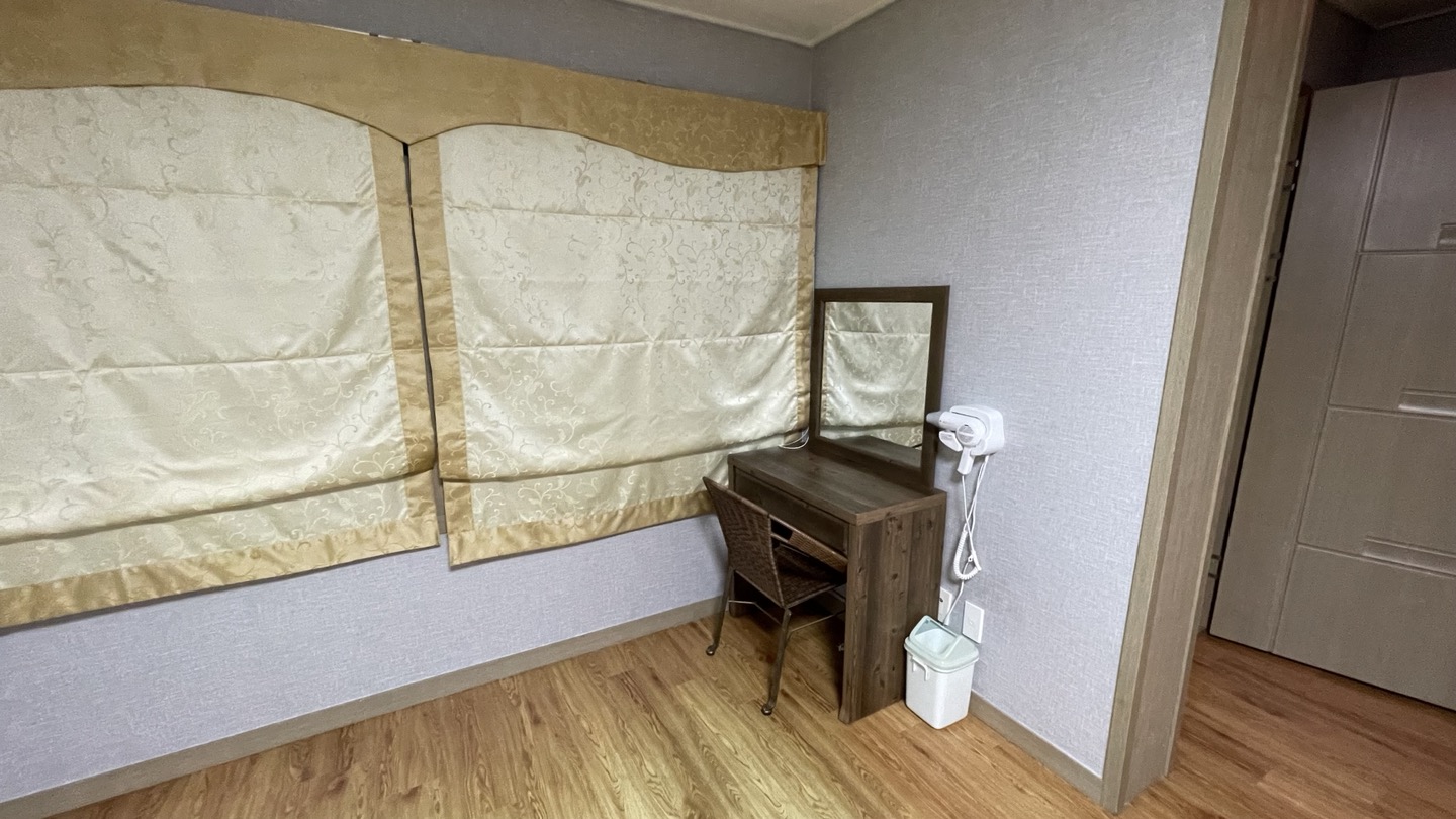 2층 방입니다. 침대와 화장대, TV, 드라이기 등이 있습니다.