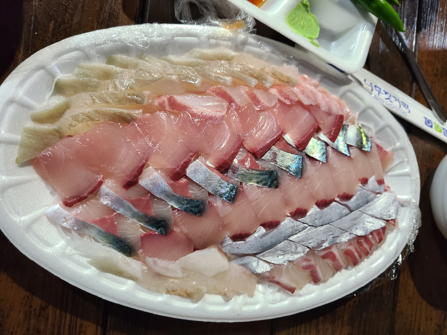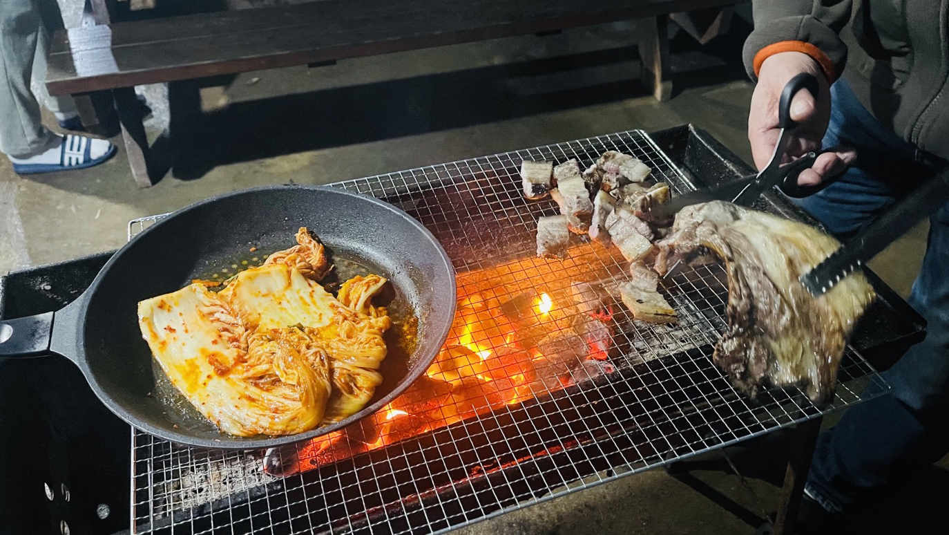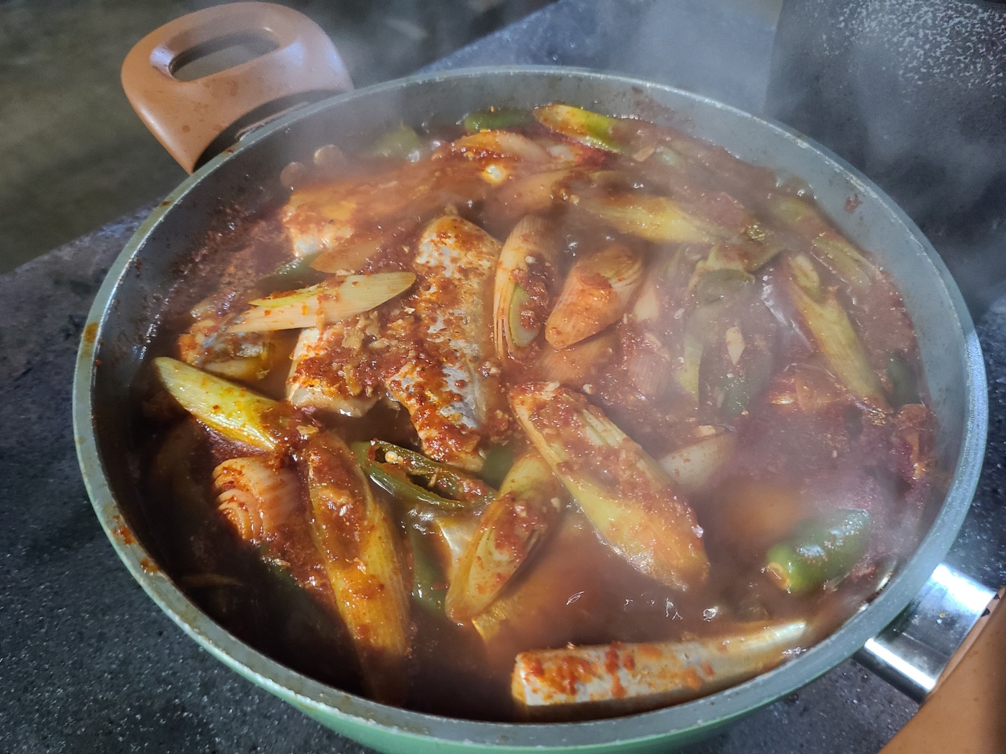 저녁식사는 바베큐장에서 고기랑 갈치 구워 먹었어요. 김치찌개랑 갈치조림도 하고요.