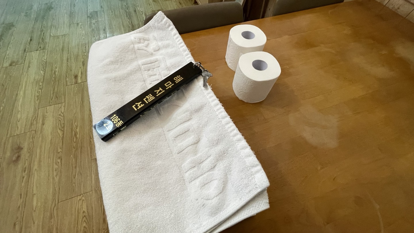 식탁위에 수건이 준비되어 있었습니다. 2가구가 쓸 수건이라 넉넉히 준비되어 있었어요.