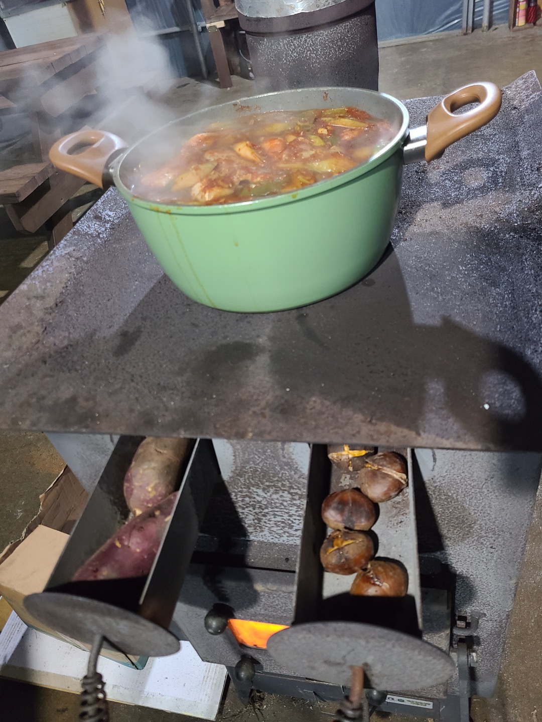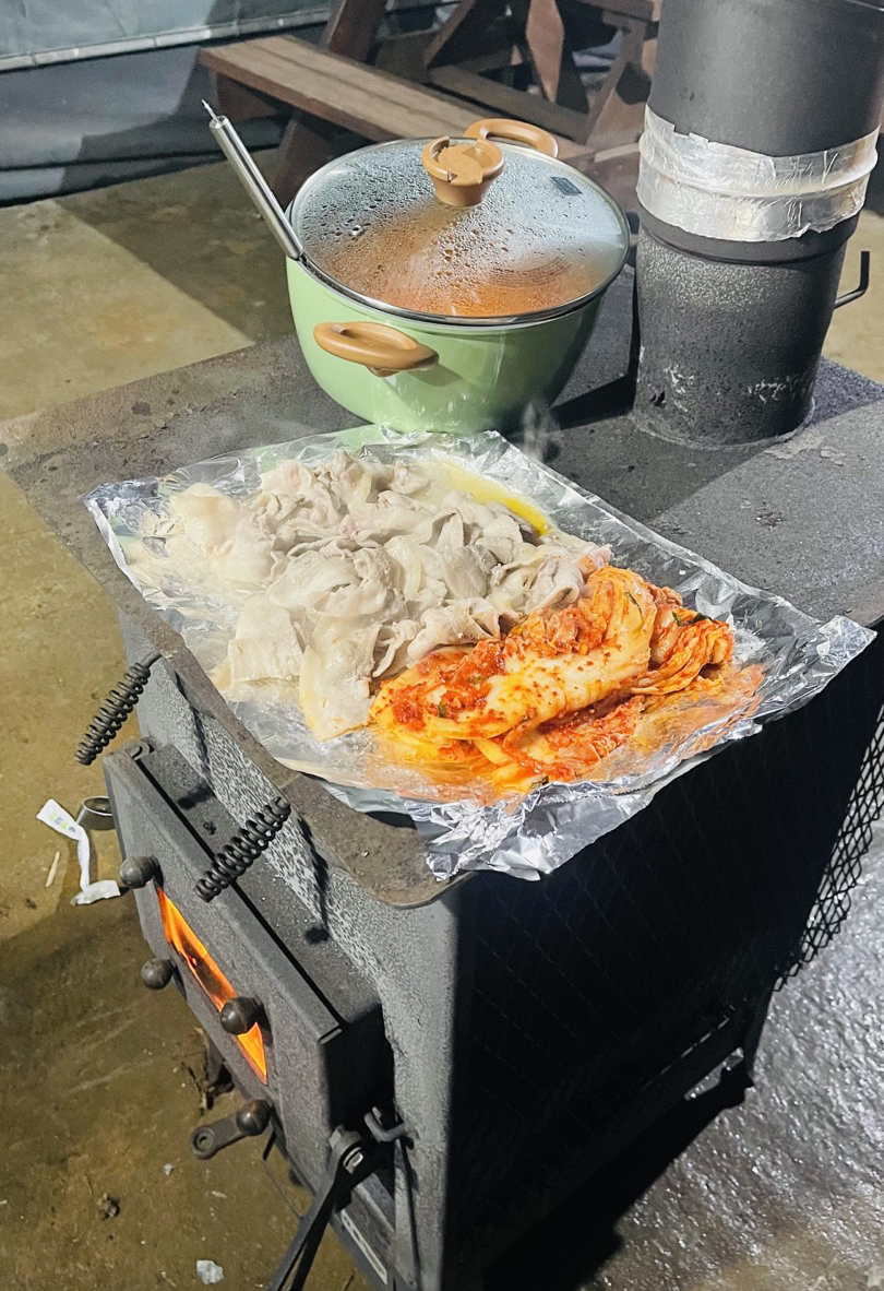 저녁식사는 바베큐장에서 고기랑 갈치 구워 먹었어요. 김치찌개랑 갈치조림도 하고요.