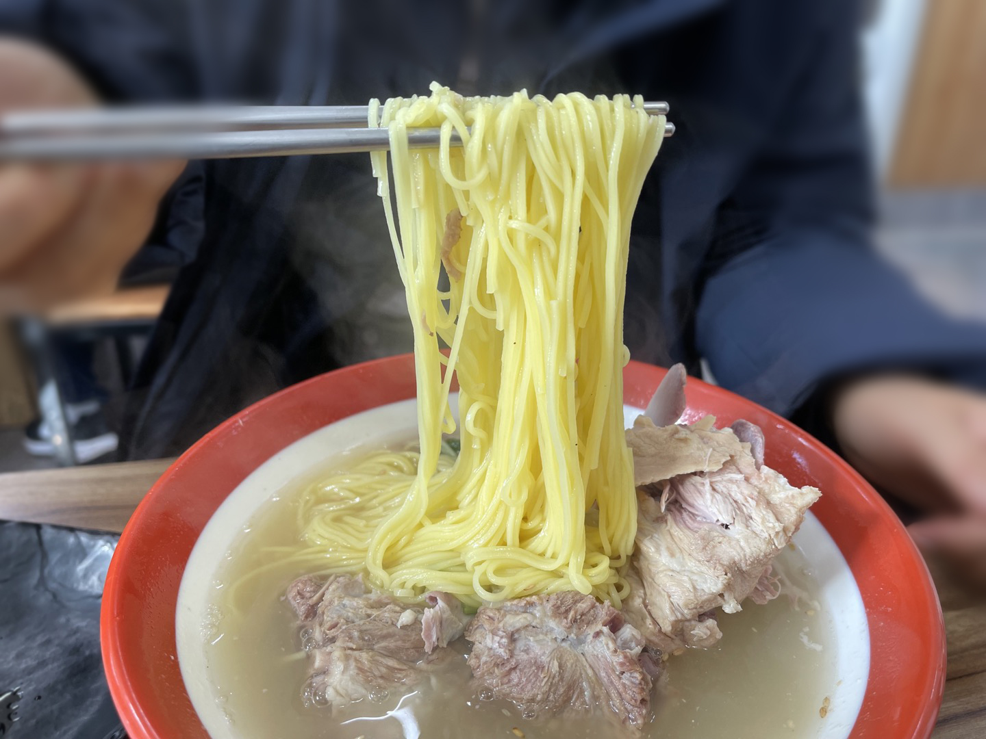 전혀 생각하지 못했던 비주얼이라 신기했어요. 돼지등뼈와 그 국물에 생면이 말아져 나옵니다.