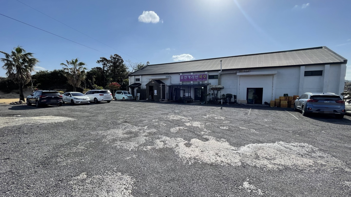 표선카라반국수 주차장 모습입니다. 건물 뒤쪽으로 해변이 펼쳐져 있습니다.