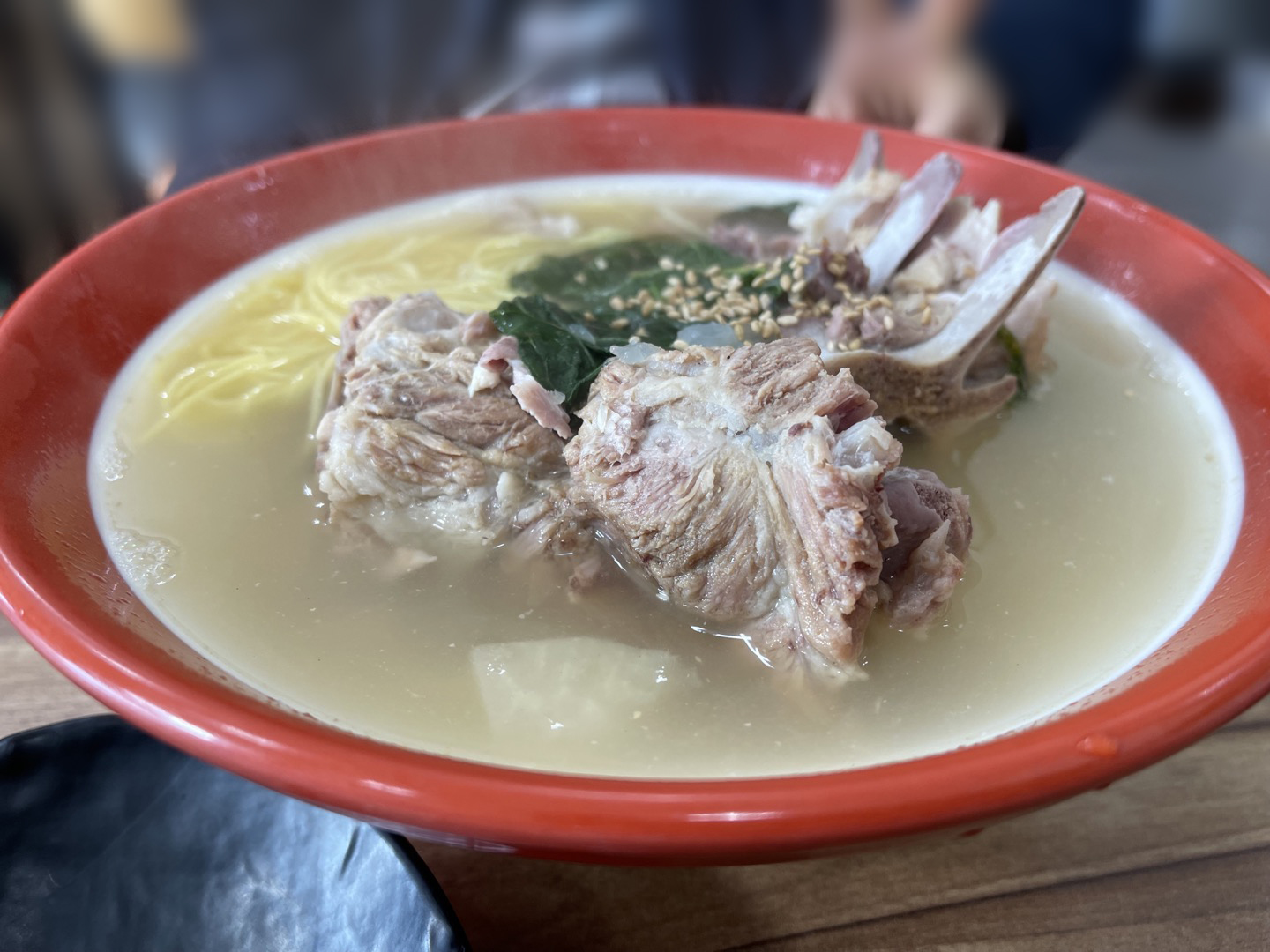 전혀 생각하지 못했던 비주얼이라 신기했어요. 돼지등뼈와 그 국물에 생면이 말아져 나옵니다.