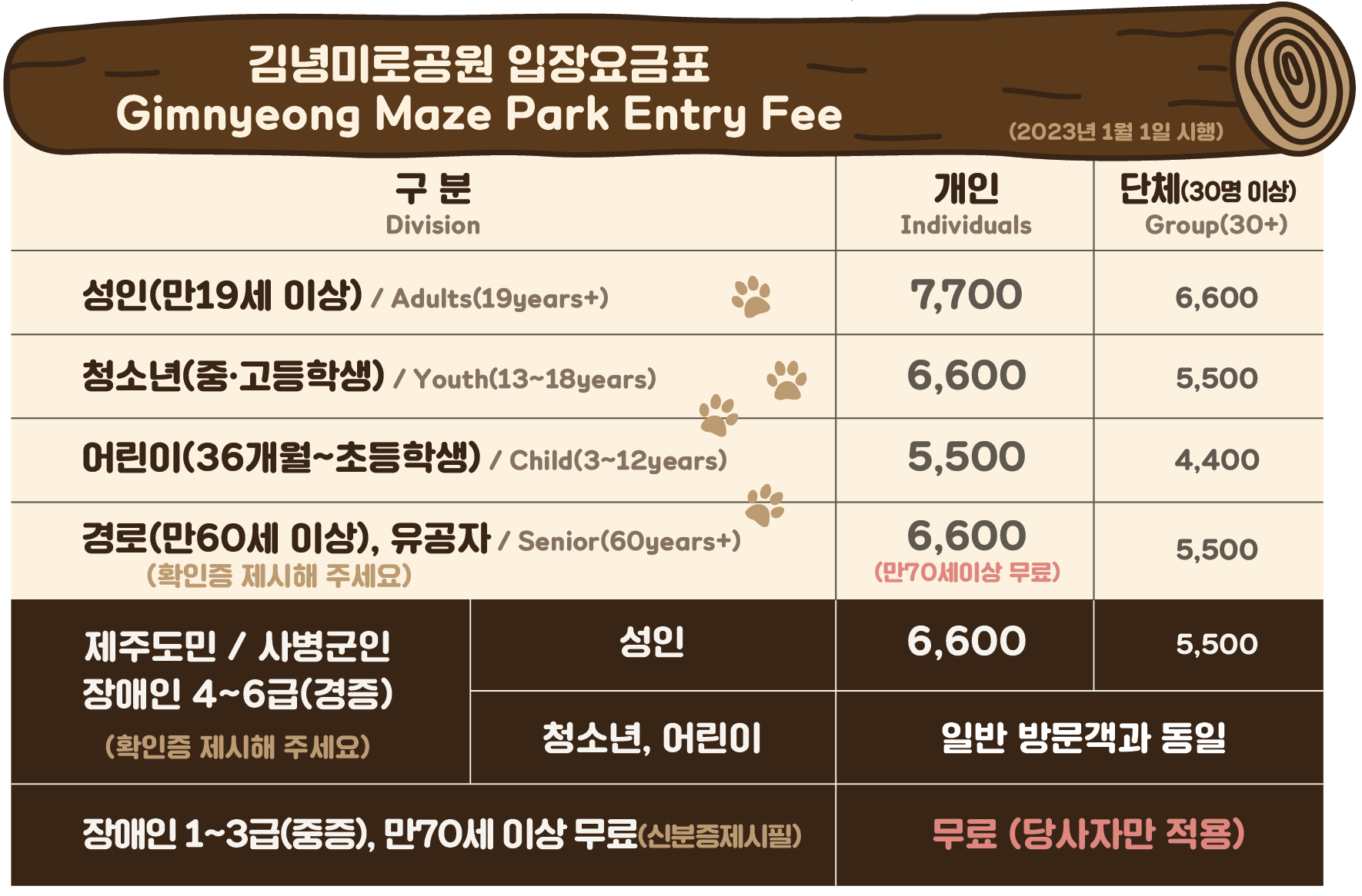 김녕미로공원 입장요금표입니다.