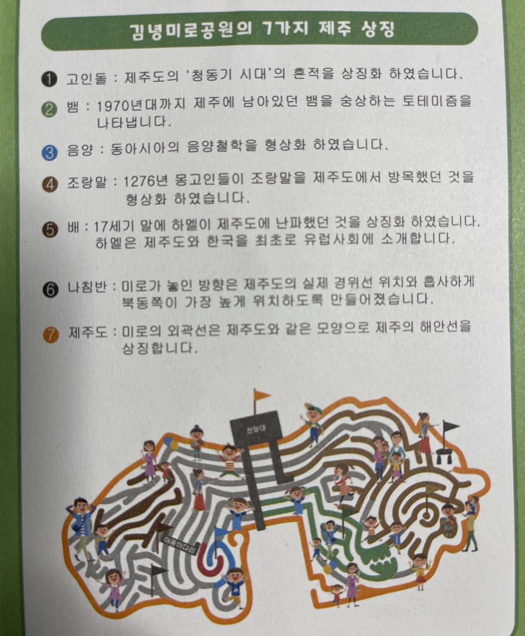 김녕미로공원의 형상은 제주도 역사를 상징하는 7가지 상징물인 고인돌, 뱀, 음양, 조랑말, 배, 나침반, 제주도를 나타내고 있다고 해요.
