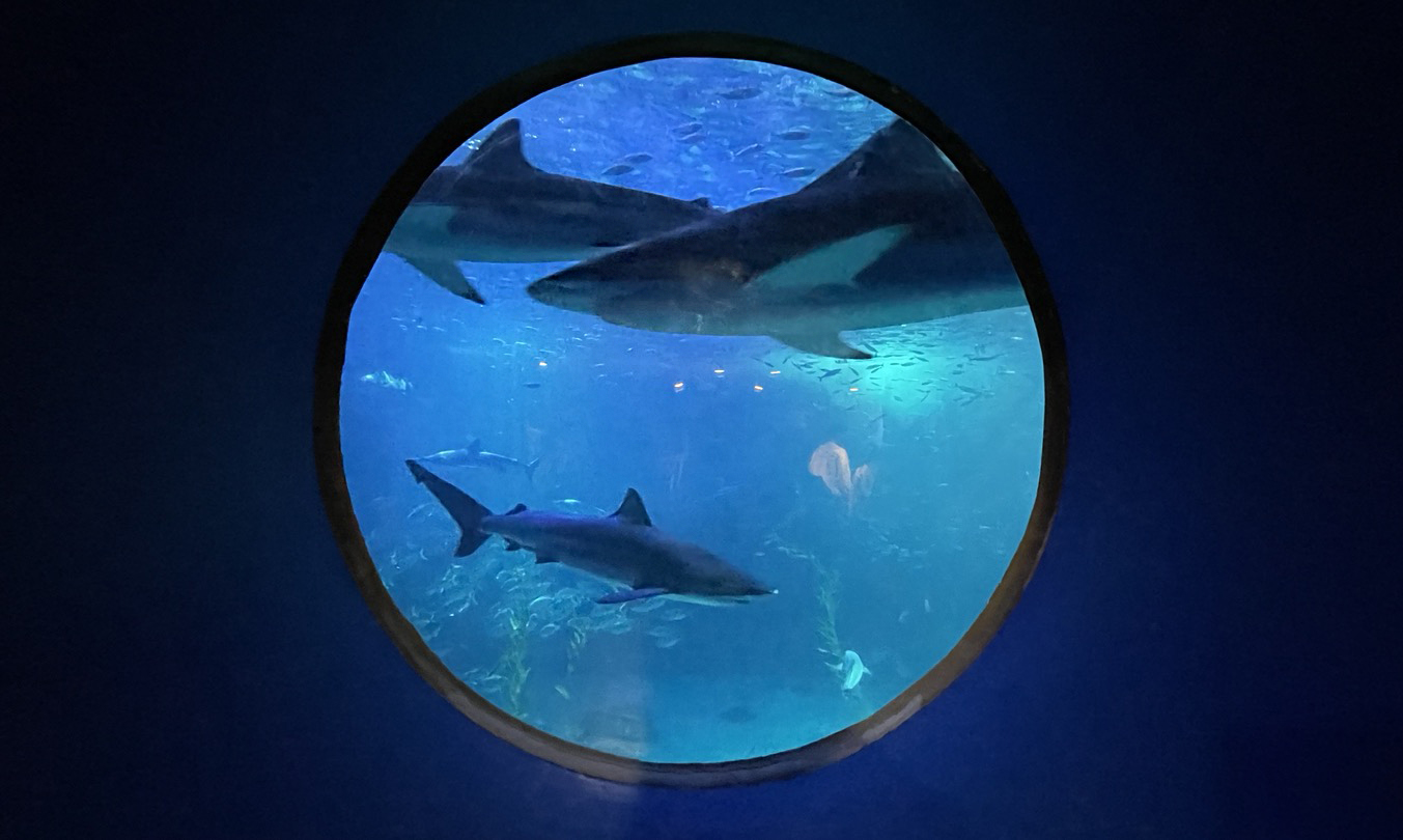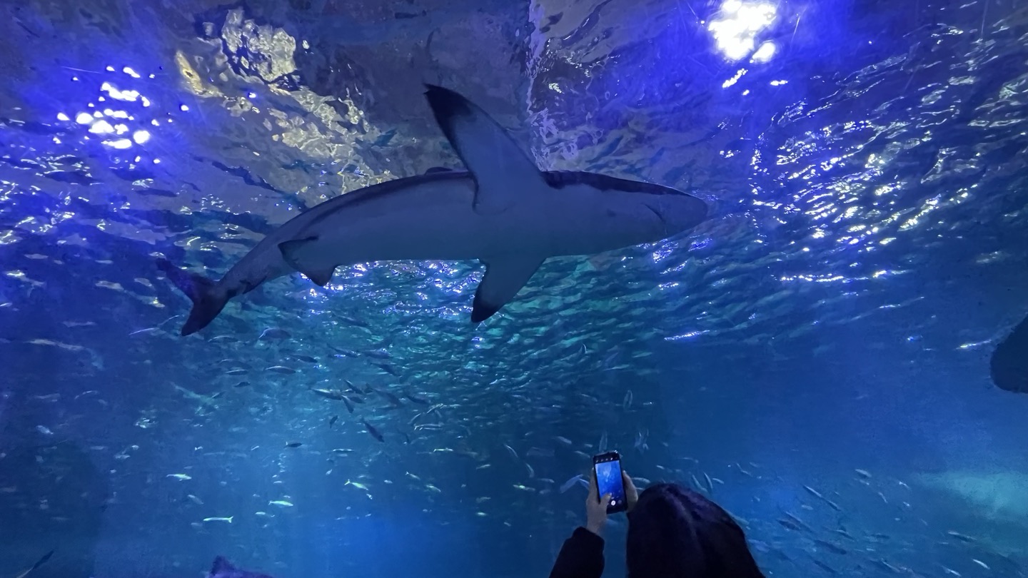 대형상어 '샌드타아거샤크'가 있는 수족관이에요. 정어리떼들도 무리지어 헤엄치고 있습니다.