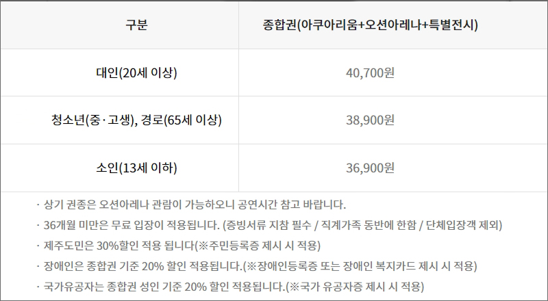 제주도민, 장애인, 국가유공자는 할인 적용이 되고, 36개월 미만은 무료입장입니다.