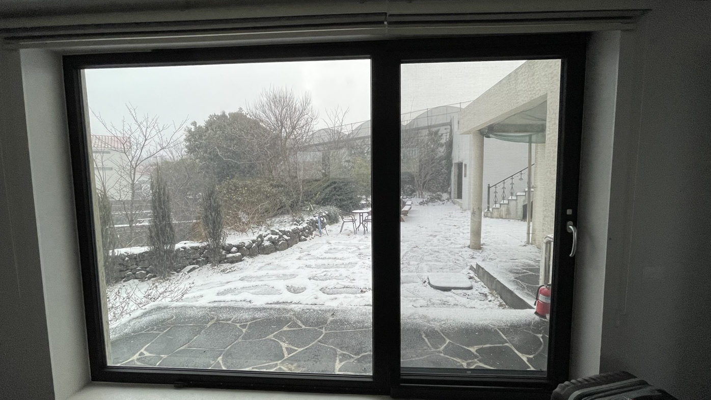 눈보라를 뚫고 숙소까지 오는길은 그야말로 전쟁통 같았는데, 도착해서 창을 통해 바라보는 바깥 풍경은 평화롭기가 그지없습니다. 창 하나를 사이에 두고 이리도 마음이 달라지네요.^^;;