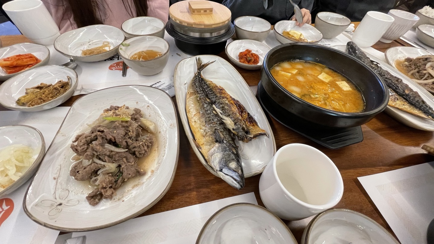 고등어구이, 소불고기, 돌솥밥, 된장찌개, 밑반찬 등 나오네요.