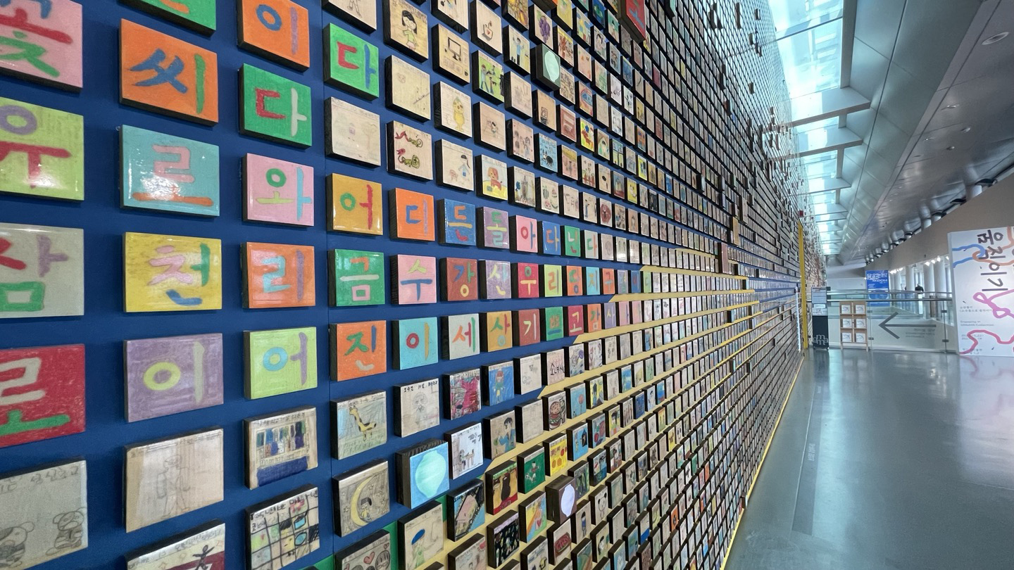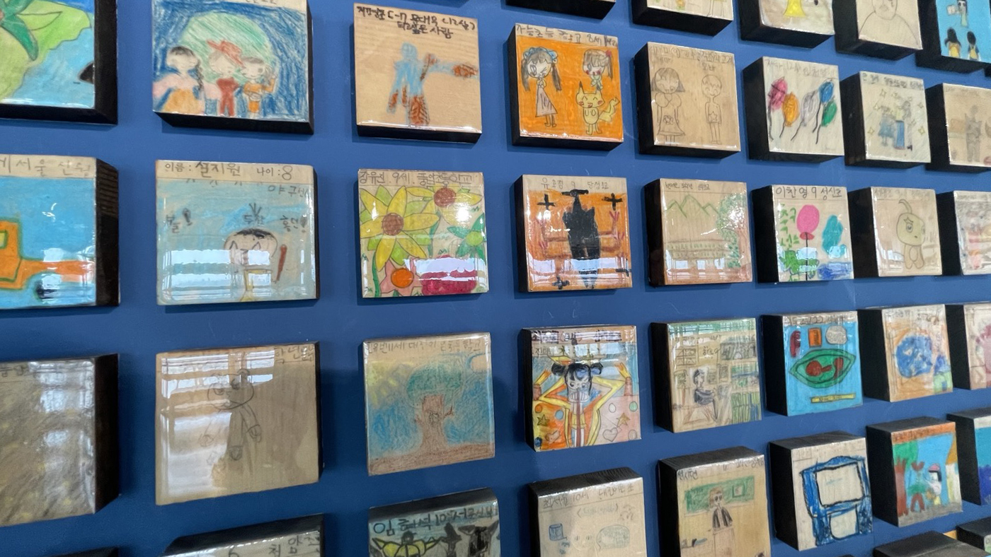 2층 벽면은 학생들이 나무토막에 그린 작품으로 빼곡히 채워져 있어서 인상적이었어요.