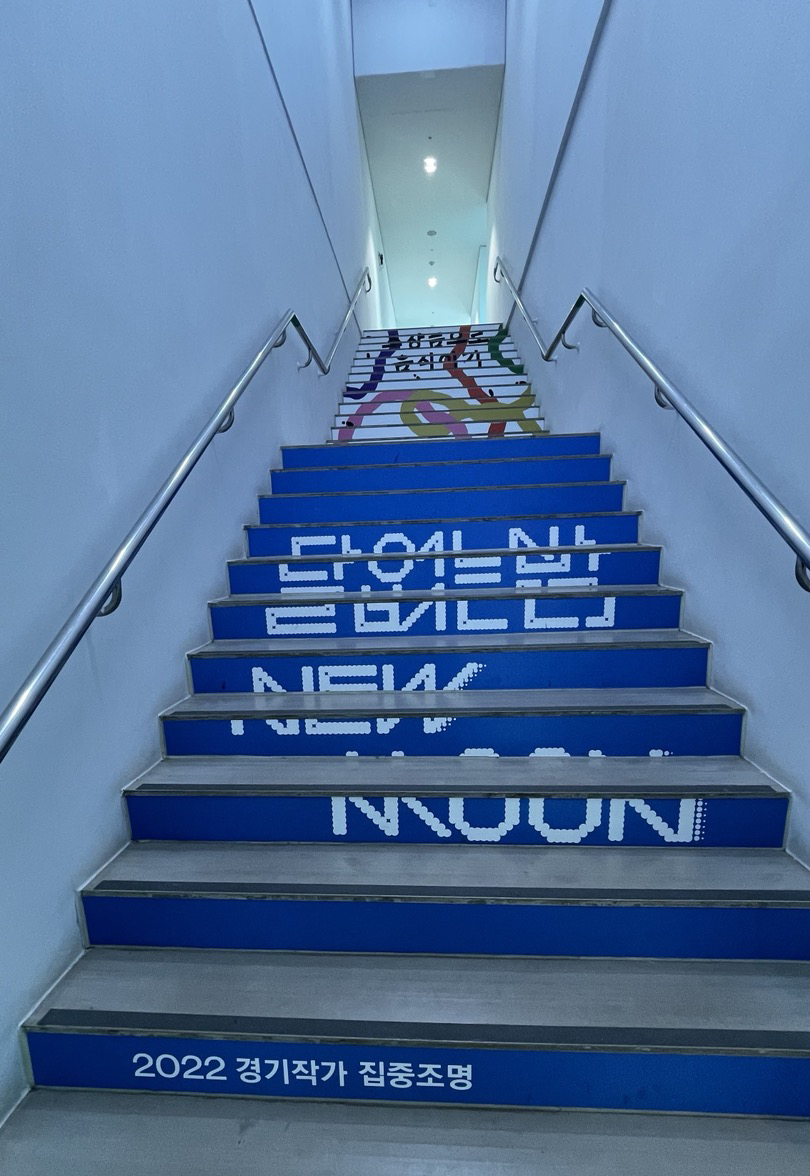 2층으로 올라가는 계단이에요. 계단 측면이 진행 중인 전시제목으로 꾸며져 있네요.