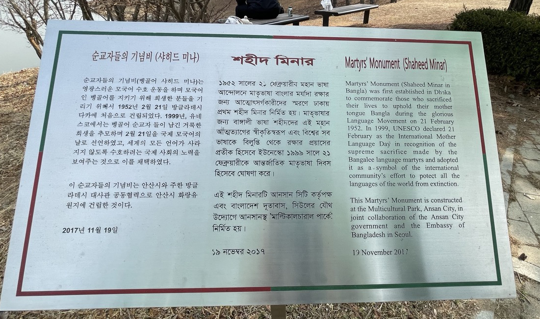 이 기념비는 모국어인 뱅골어 '샤히드 미나' 수호운동을 하다 희생된 분들을 기리기 위해 안산시와 주한 방글라데시 대사관 공동협력으로 건립된 것이라고 해요.