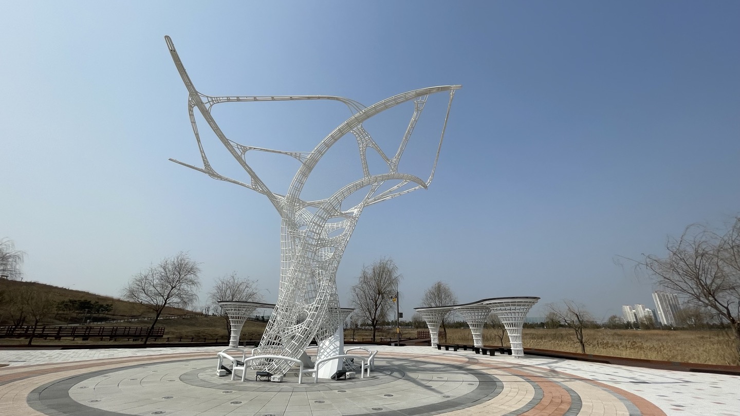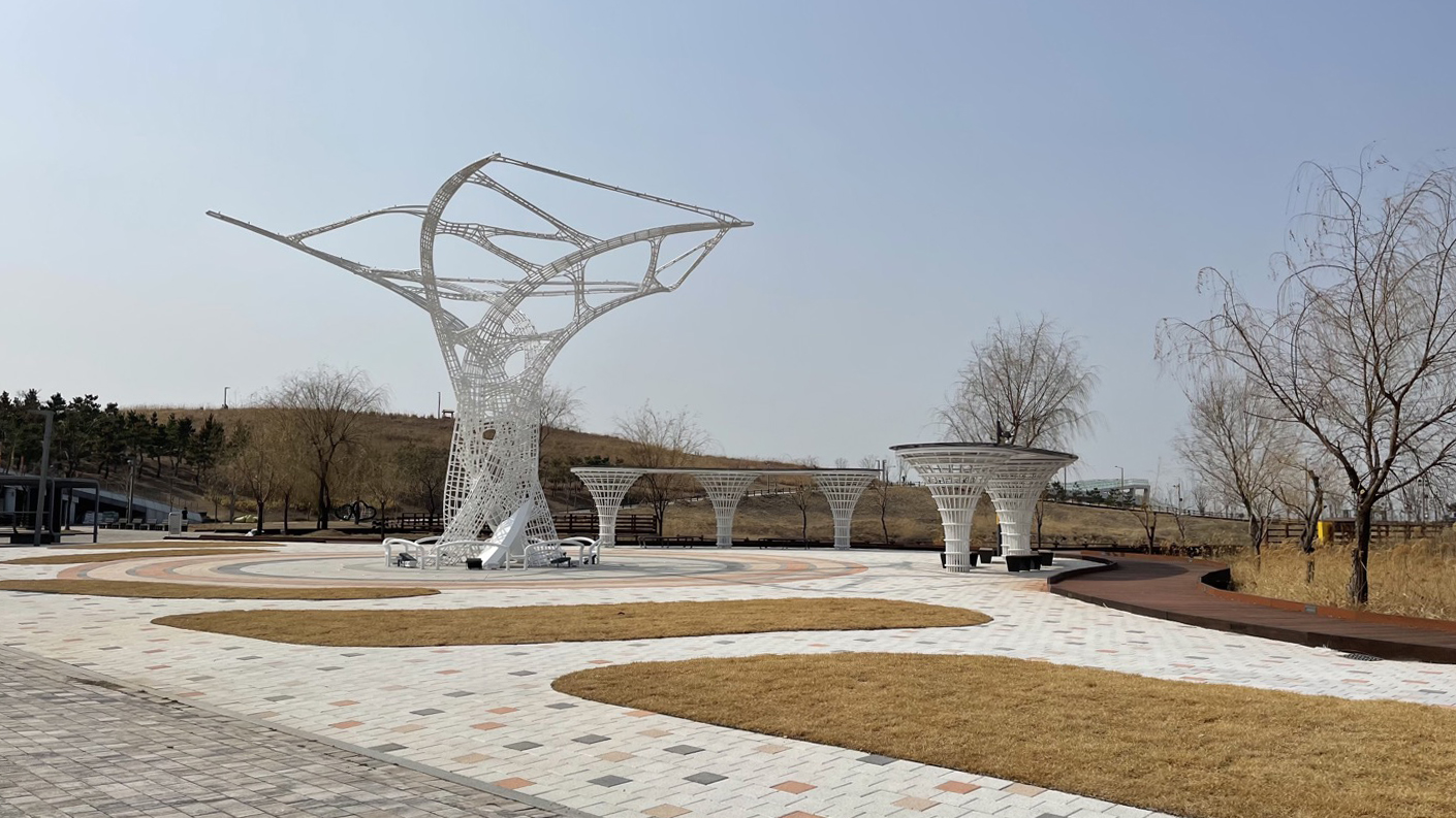 멋지게 생긴 나무형태의 조형물이 공원 중앙에 세워져 있습니다.