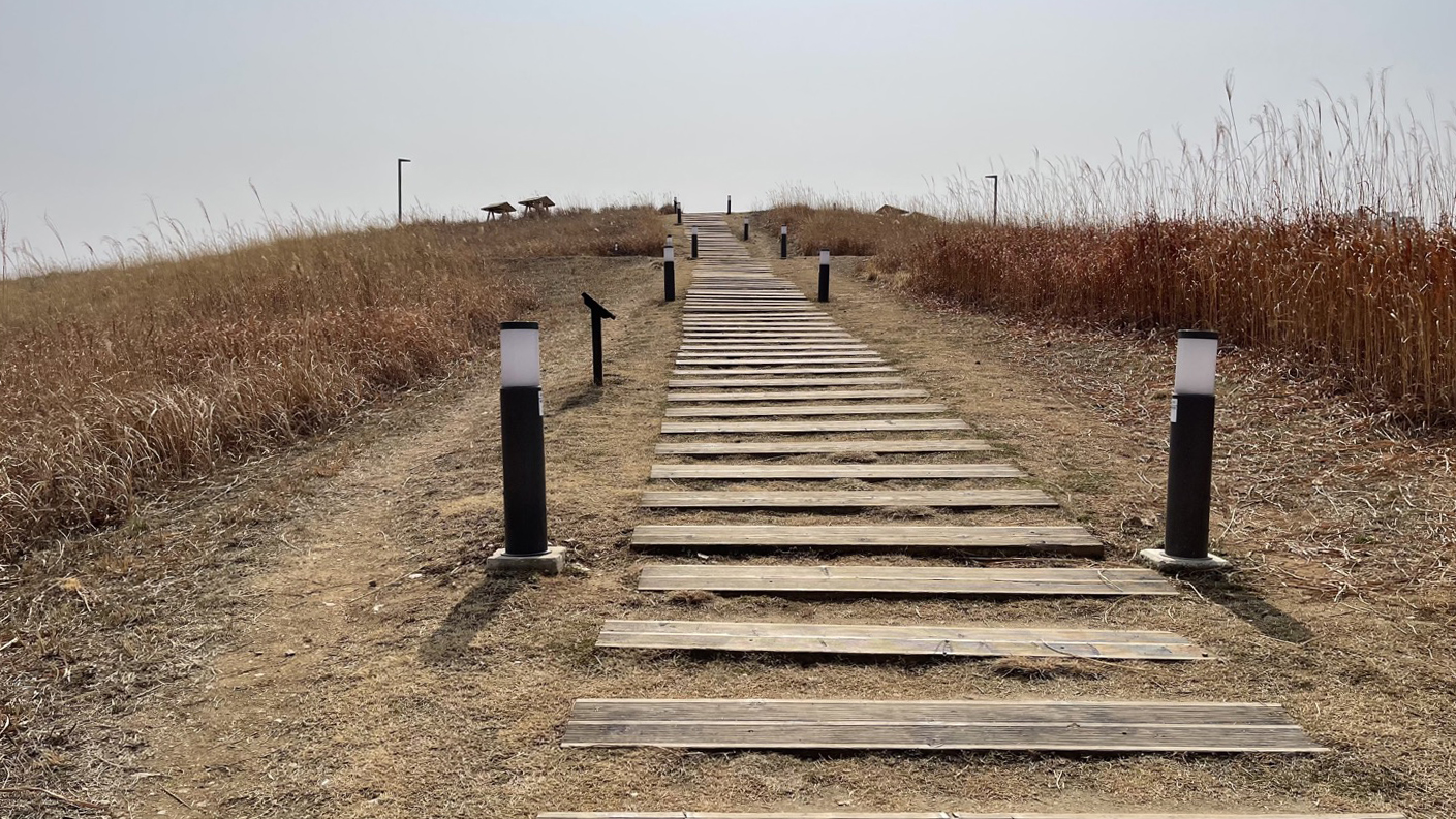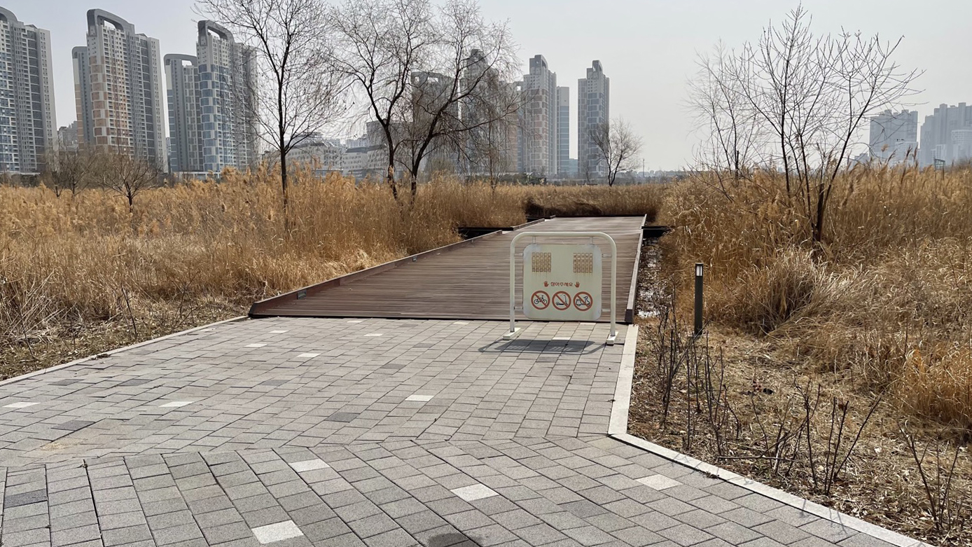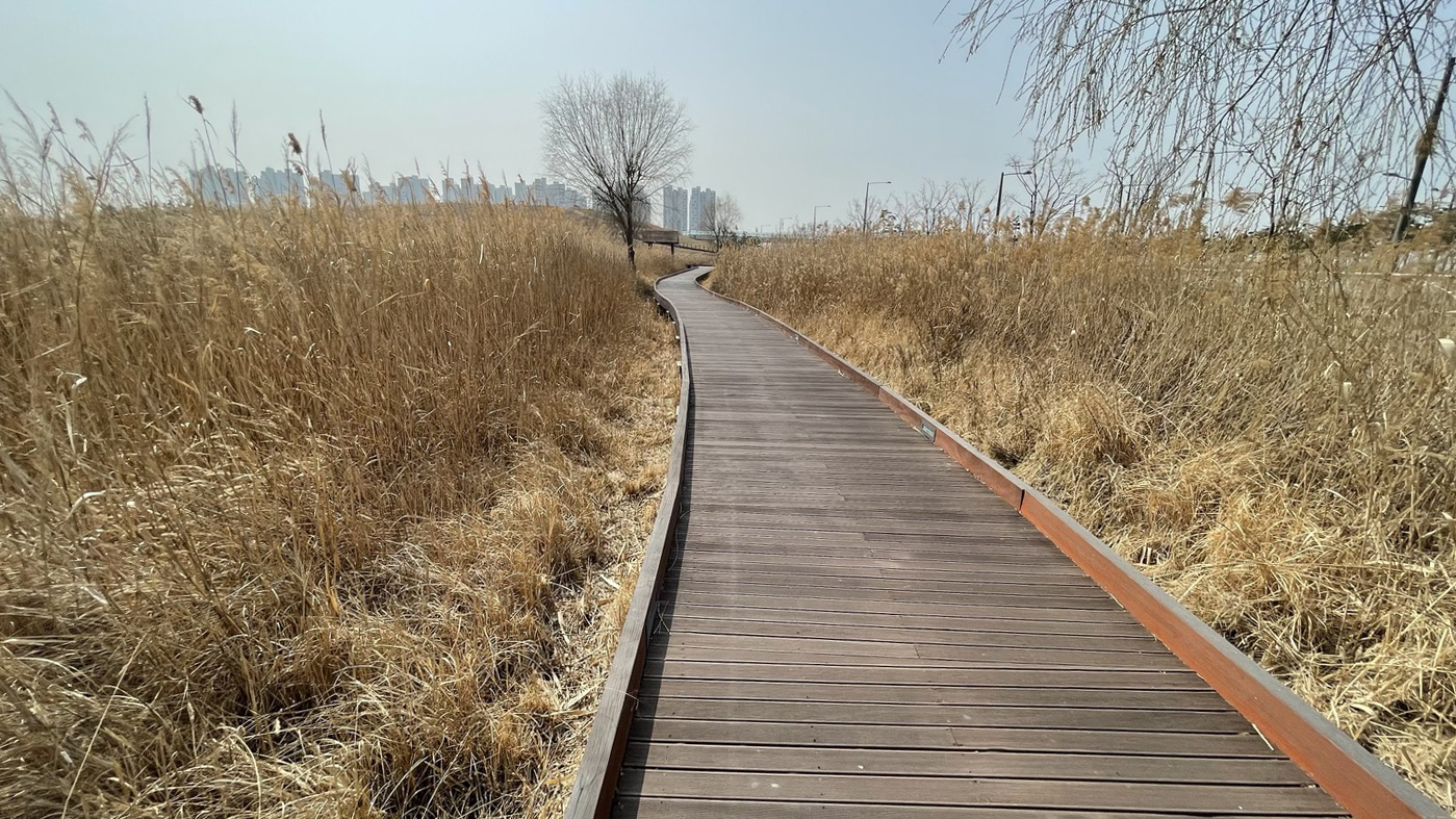 아파트 단지를 따라 걷다보면 넓은 갈대밭이 보이는데요. 이 곳 나무데크길을 따라 가면 배곧생명공원까지 갈 수 있습니다.